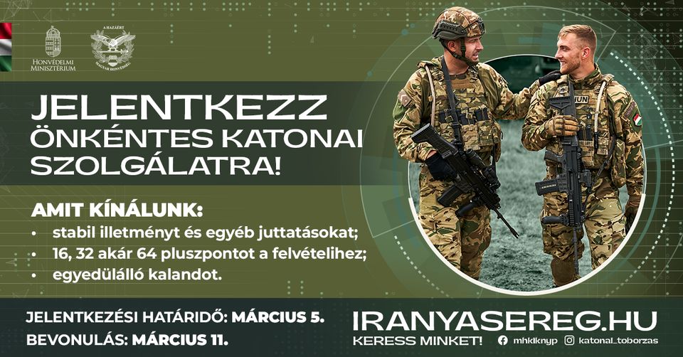 📲 Jelentkezz március 05-ig és az Önkéntes Katonai Szolgálattal egyszerre jutsz közelebb felsőoktatási céljaidhoz és leszel a haza védelmezője.