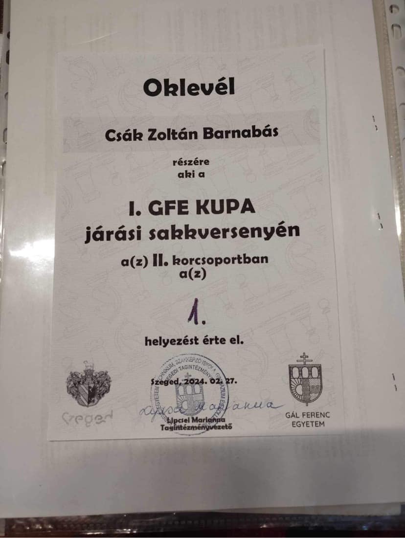 A tavalyi diákolimpiai sikerek után újabb szép eredményt ért el Csák Zoltán Barnabás, iskolánk 11.B osztályos diákja. A Szegeden megrendezett Gál Ferenc Egyetemi Kupán, a II. korcsoportban győzedelmeskedett, így ő lett a járás legjobb ifjú sakkozója. Szívből gratulálunk, Barni! 🤗