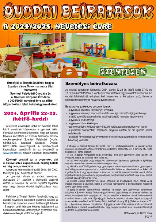 Értesítjük a Tisztelt Szülőket, hogy a Szentes Város Önkormányzata által fenntartott Szentesi Felsőpárti Óvodába és a Szentesi Központi Óvodába a 2024/2025. nevelési évre az alábbi időpontokban lehet beíratni gyermekeiket: