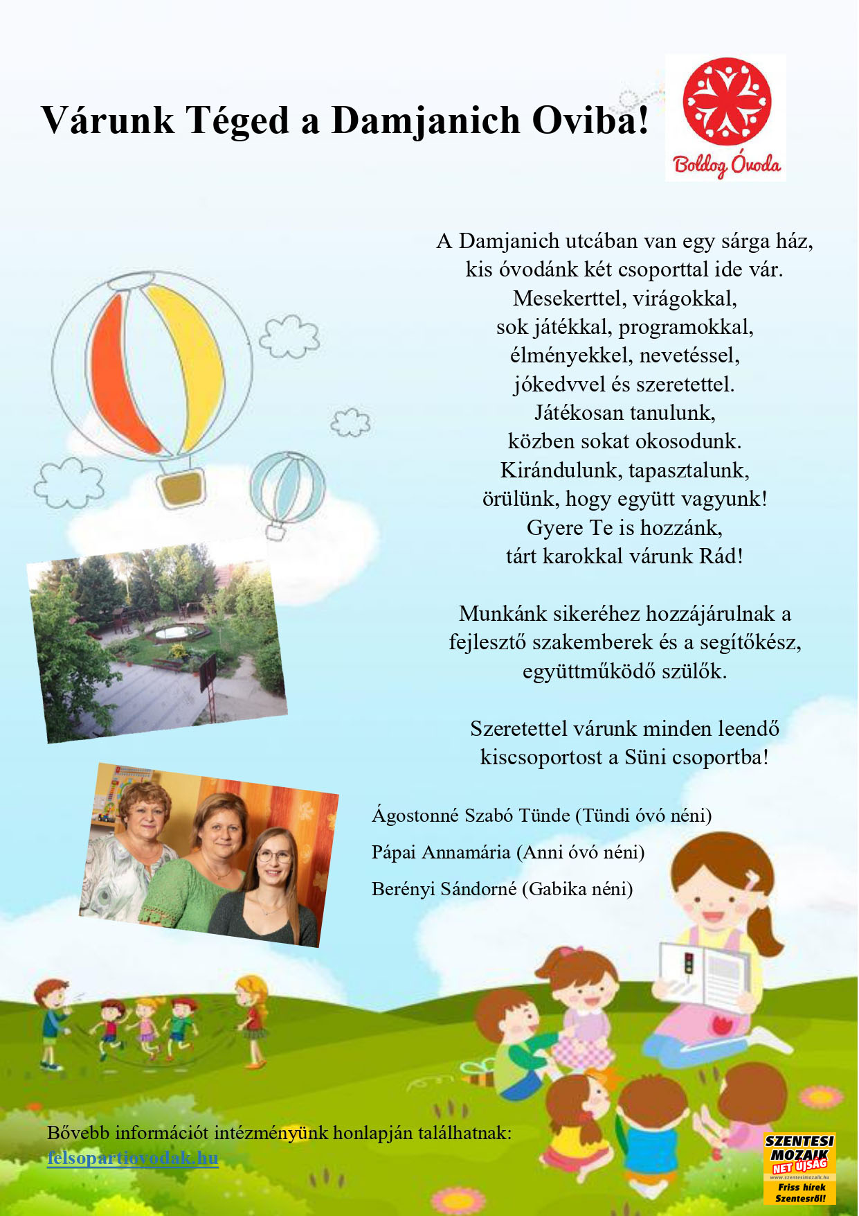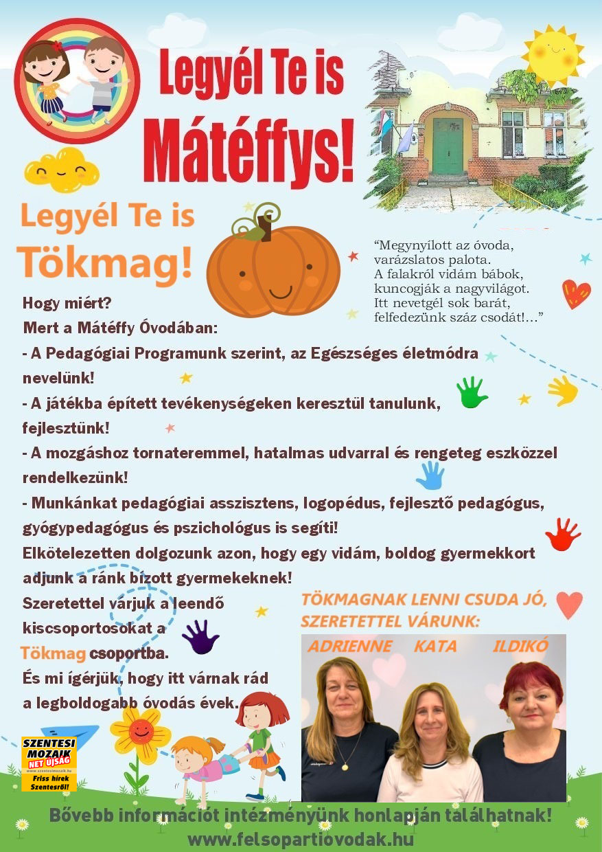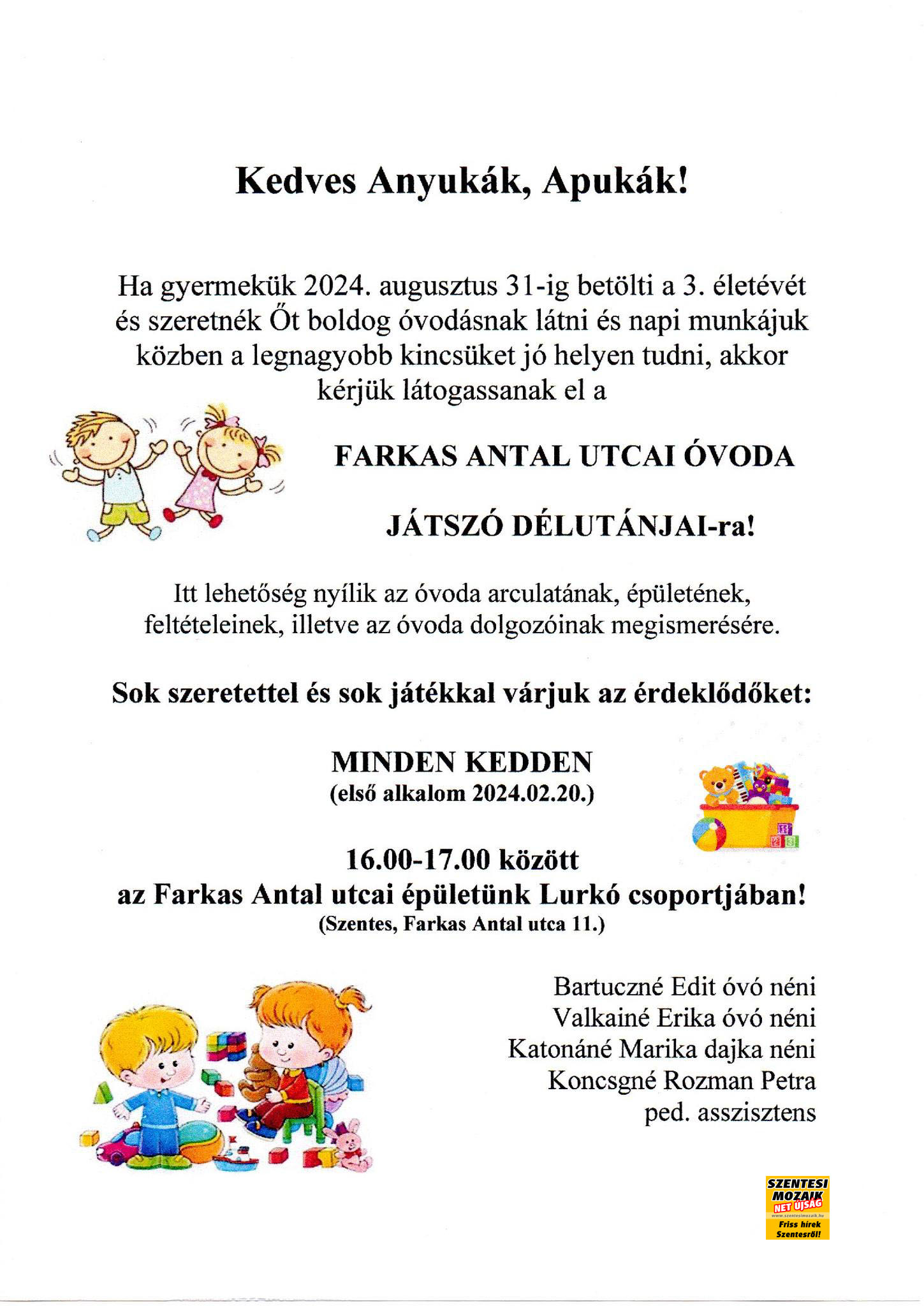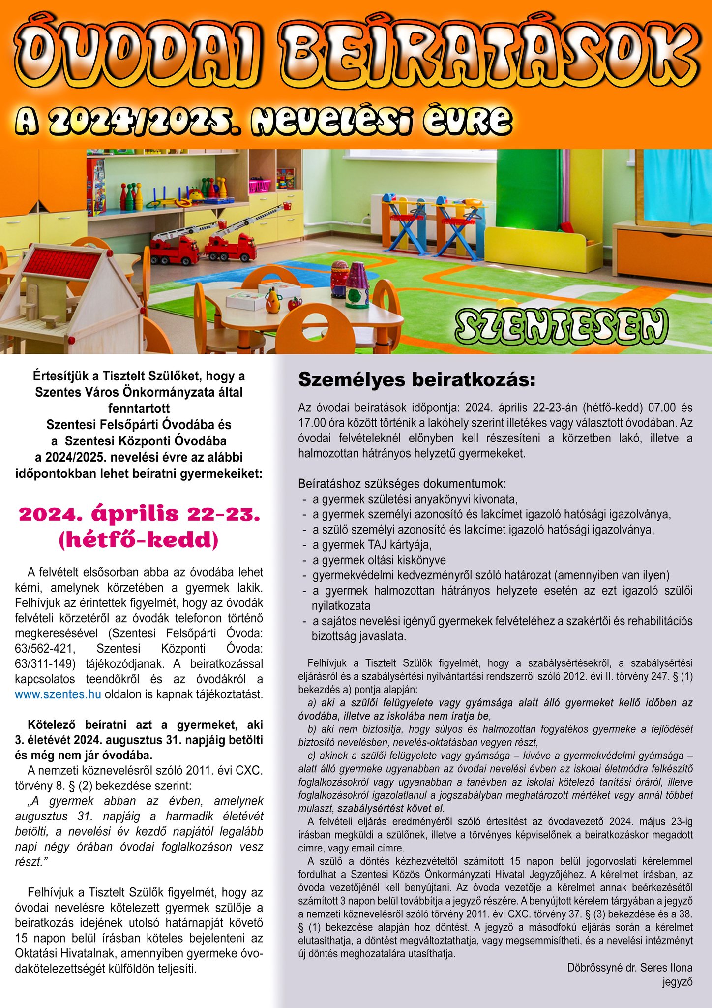 Értesítjük a Tisztelt Szülőket, hogy a Szentes Város Önkormányzata által fenntartott Szentesi Felsőpárti Óvodába és a Szentesi Központi Óvodába a 2024/2025. nevelési évre az alábbi időpontokban lehet beíratni gyermekeiket: