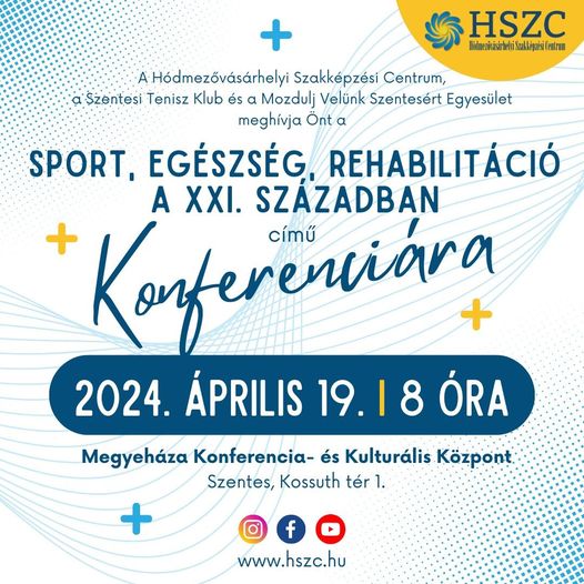 A Hódmezővásárhelyi Szakképzési Centrum, a Szentesi Tenisz Klub és a Mozdulj Velünk Szentesért Egyesület meghívja Önt a Sport, Egészség, rehabilitáció a XXI. században című konferenciára.