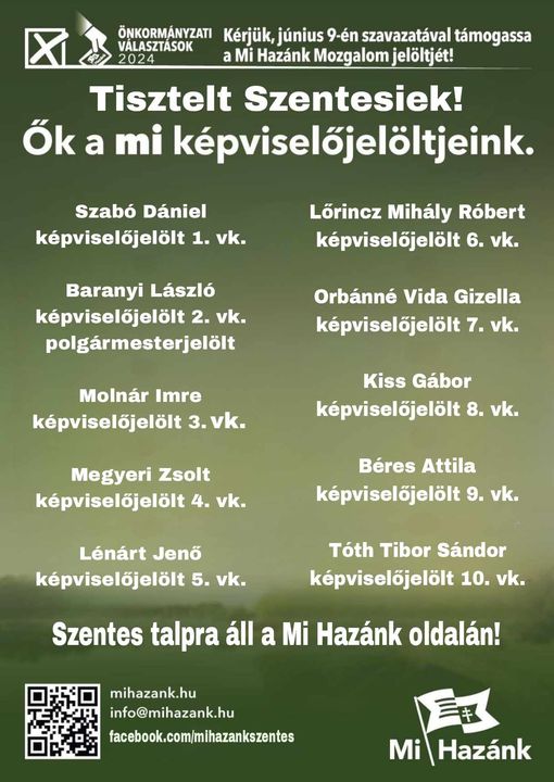 A Mi Hazánk Mozgalom az alábbi plakáton ismerteti a 2024. június 9-ei önkormányzati képviselői és polgármesteri választáson induló jelöltjeit.