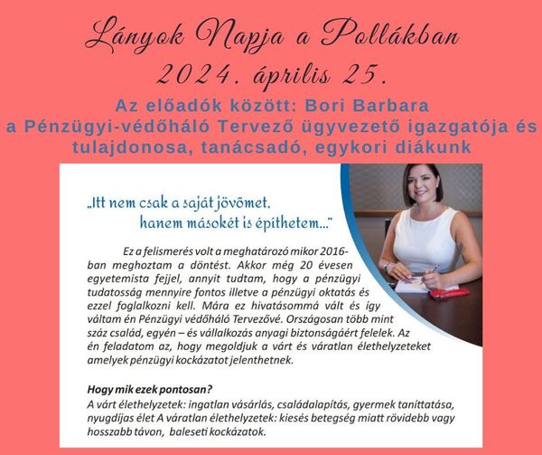 Ennek jegyében jelentjük be a program második meghívott előadóját, Bori Barbarát, a Pénzügyi- védőháló Tervező tulajdonosát, ügyvezető igazgatóját, aki 2015-ben érettségizett iskolánkban.
