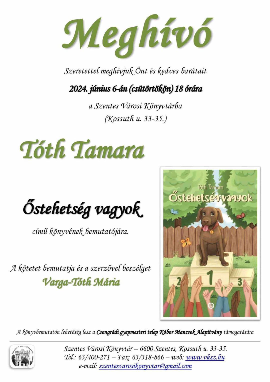 – Nagyon boldoggá tesz, hogy a szentesi bemutatómon lehetőségetek nyílik rá, hogy a Csongrádi gyepmesteri telep Kóbor Mancsokat támogassátok. Gyertek el minél többen érezzétek jól magatokat a bemutatón és támogassunk együtt egy igazán jó célt! Mert minden állat a legjobb esélyeket érdemli! – tette még hozzá a szerző.