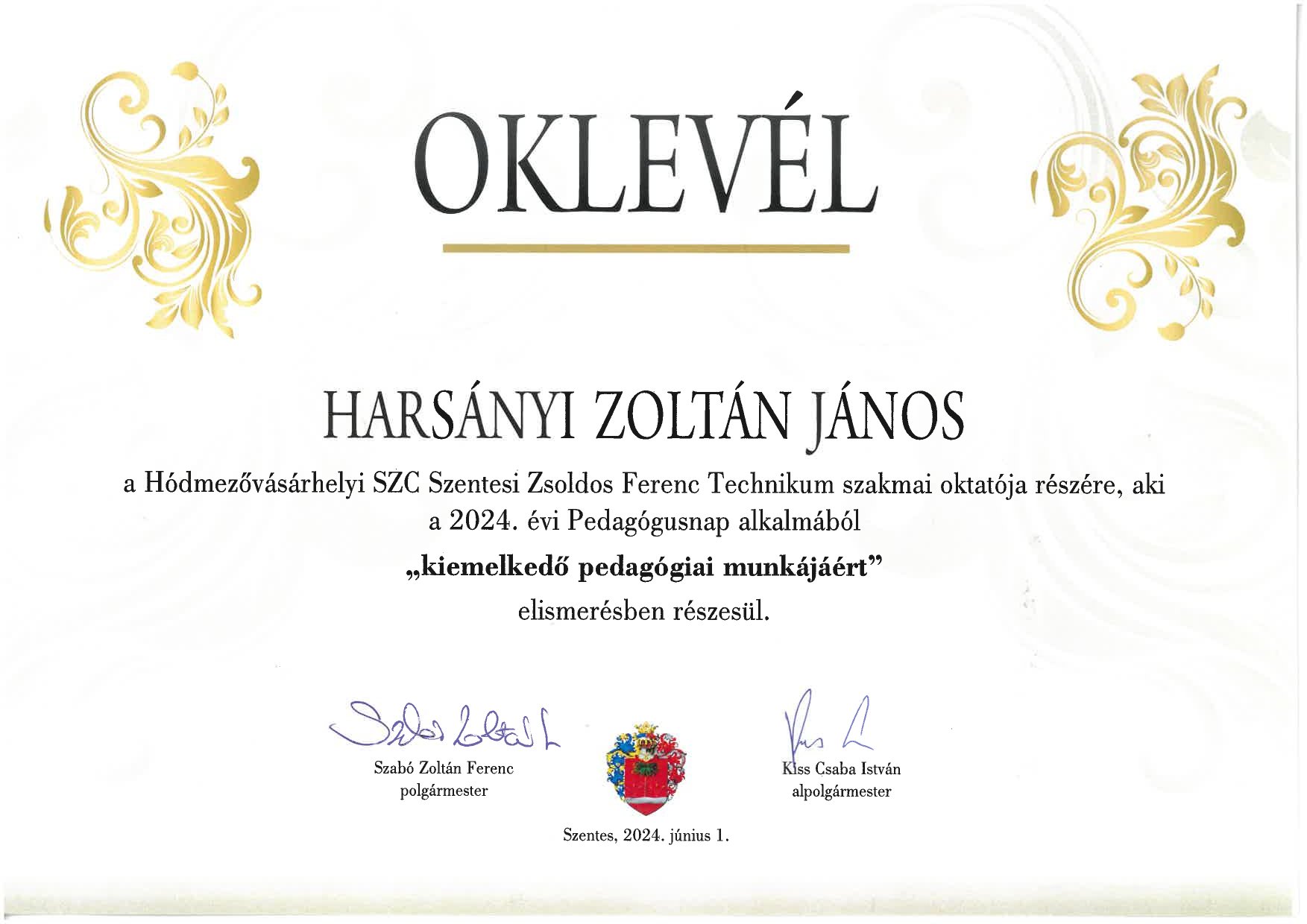 2024. június 1-jén Harsányi Zoltán János a HSZC Szentesi Zsoldos Ferenc Technikum hegesztő szakoktatója városi elismerésben részesült a kiemelkedő pedagógiai munkájáért.