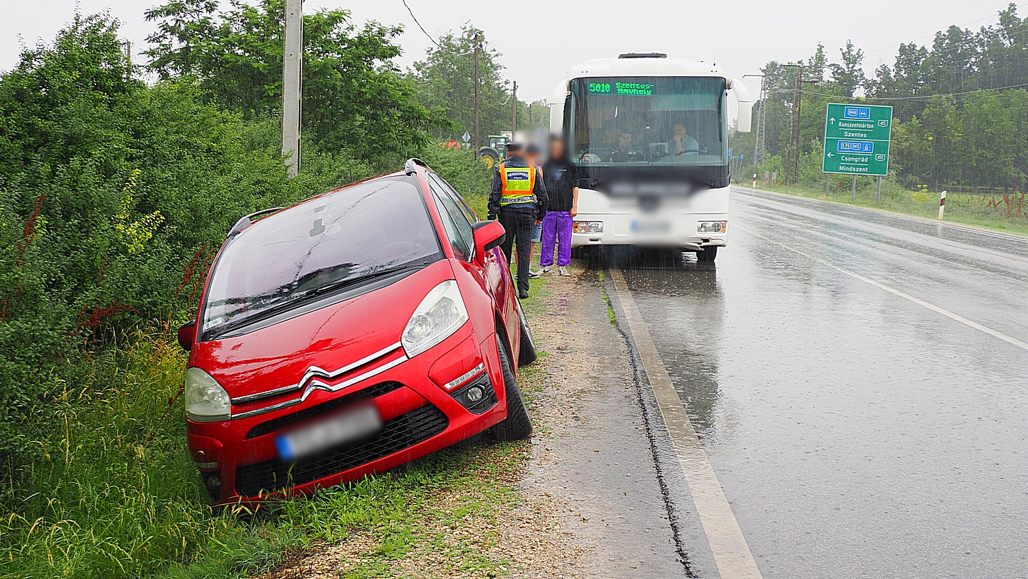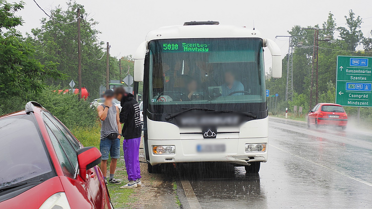 Az autóbusz Hódmezővásárhelyre tartott, amikor a neki jobbról érkező autós nem adott neki elsőbbséget és a busz elé hajtott. Az autóbusz a gépkocsi hátuljának ütközött, amitől a személyautó az útszéli árok szélére sodródott. Információnk szerint a buszon mintegy 10-15 ember utazott, akiket mentesítő járattal szállítottak tovább. A személykocsiban és a buszon lévők közül senki nem sérült meg. A helyszínelés idején félpályás útzár volt érvényben az érintett szakaszon.