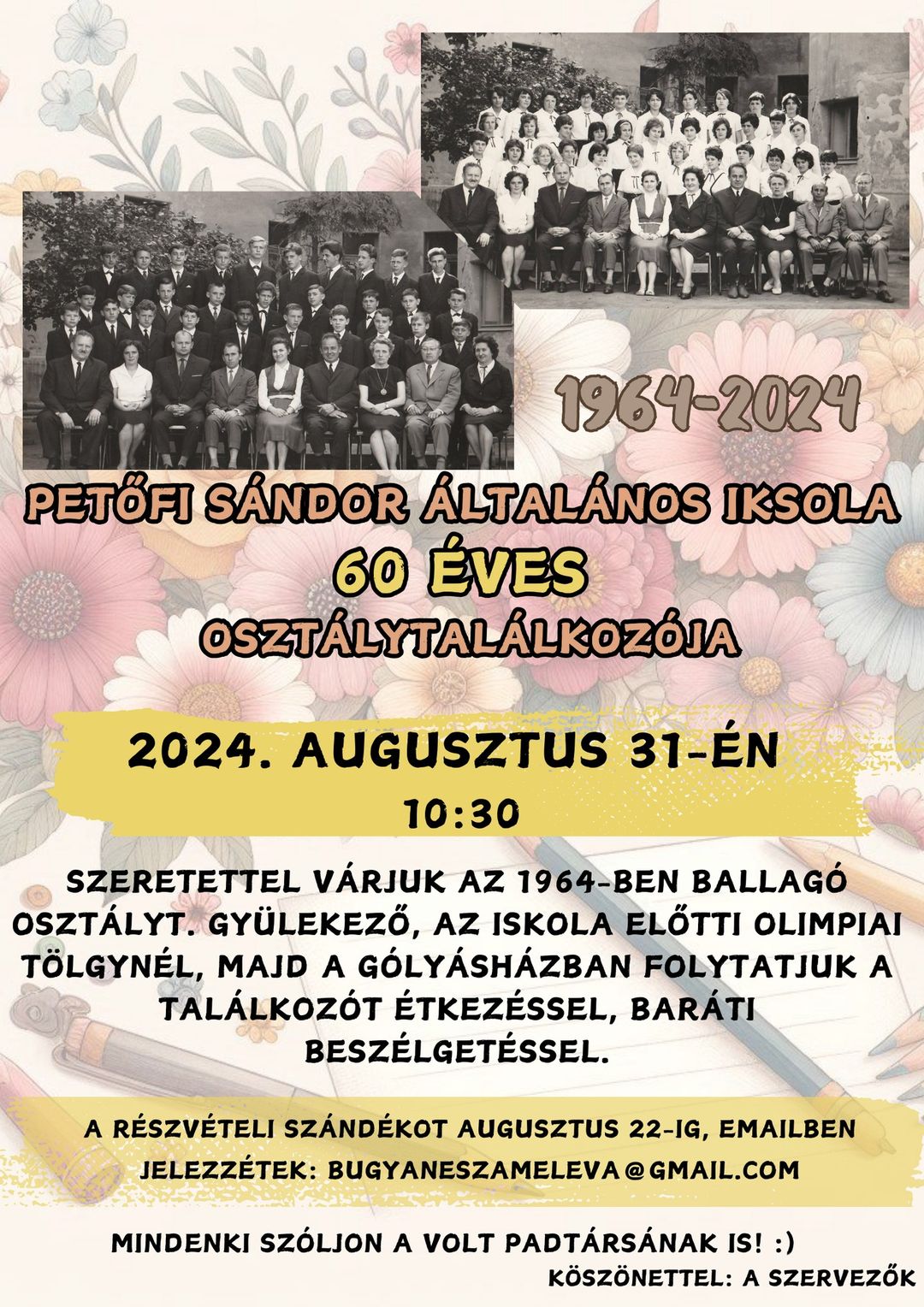 Az 1964-ben végzett Petőfi Sándor Általános Iskola egykori diákjai számára 2024. augusztus 31-én, 10:30-kor osztálytalálkozót szerveznek és találkozzanak az iskola egykori épülete előtt, az Olimpiai tölgynél. A szervezők arra kérik a résztvevőket, hogy értesítsék volt osztálytársaikat is.