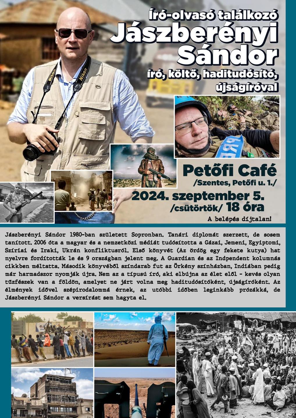 2024. szeptember 5-én 18 órai kezdettel Jászberényi Sándor író, költő, haditudósító, újságíró látogat el a Petőfi Caféba!