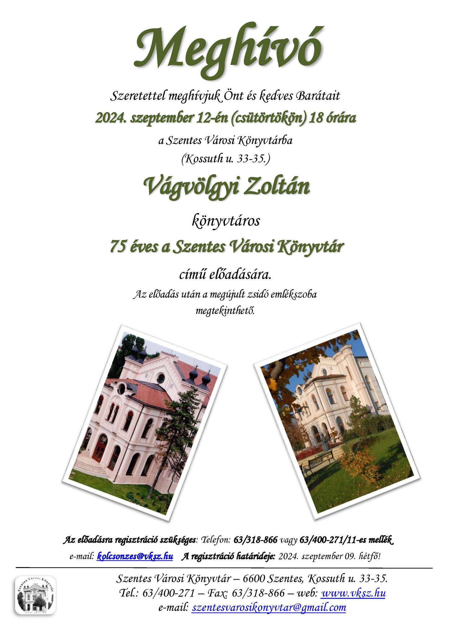18:00 75 éves a Városi Könyvtár Szentesen. Vágvölgyi Zoltán könyvtáros előadása