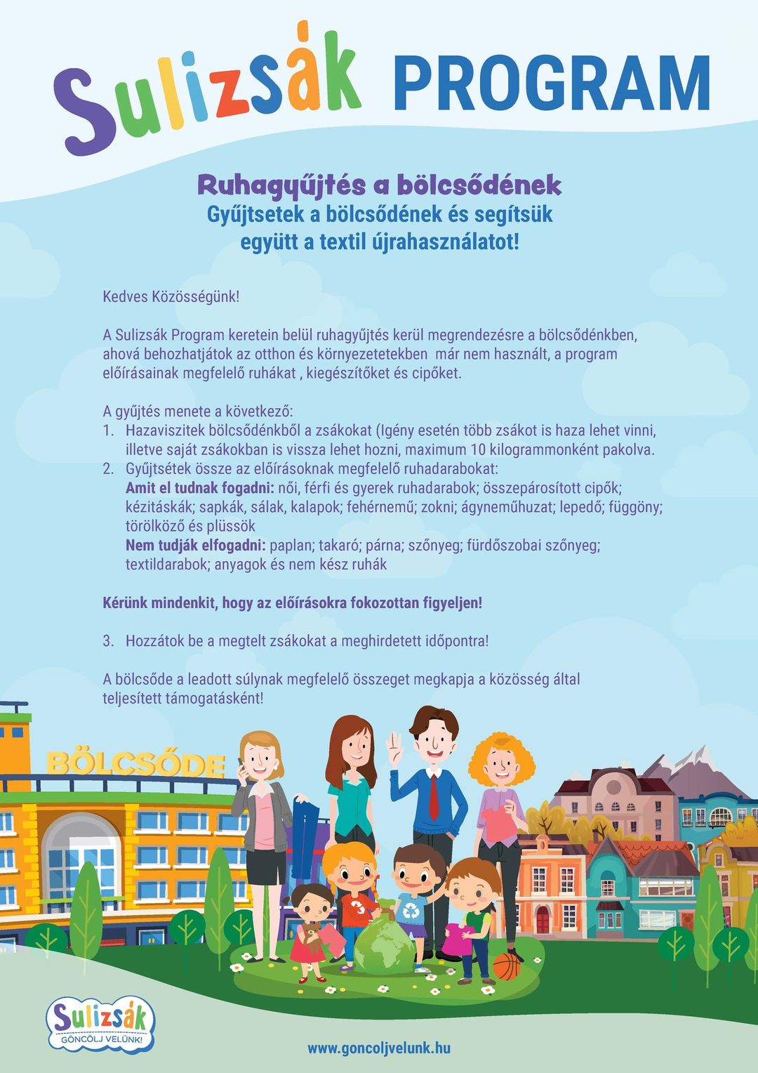 Kedves Szülők! Szentes Város Önkormányzata Bölcsődéje a „Sulizsák” program keretében ruhagyűjtést szervez. A bölcsőde szülői közössége és dolgozói a gyerekekkel együtt összegyűjthetik az otthon már feleslegessé vált ruháikat, majd ezeket elszállítás után a megfelelő válogató üzemeknek adják át – itt a ruhákat osztályozzák, és állapotuktól függően hasznos, új funkciót találnak nekik – a jobb állapotban lévők újra használatba kerülhetnek, a rosszabbak pedig rongyként, munkaeszközként maradnak a körforgásban. Így nemcsak a környezetterhelés mértékét csökkentjük, hanem a használt ruhák életciklusát is meghosszabbítjuk.