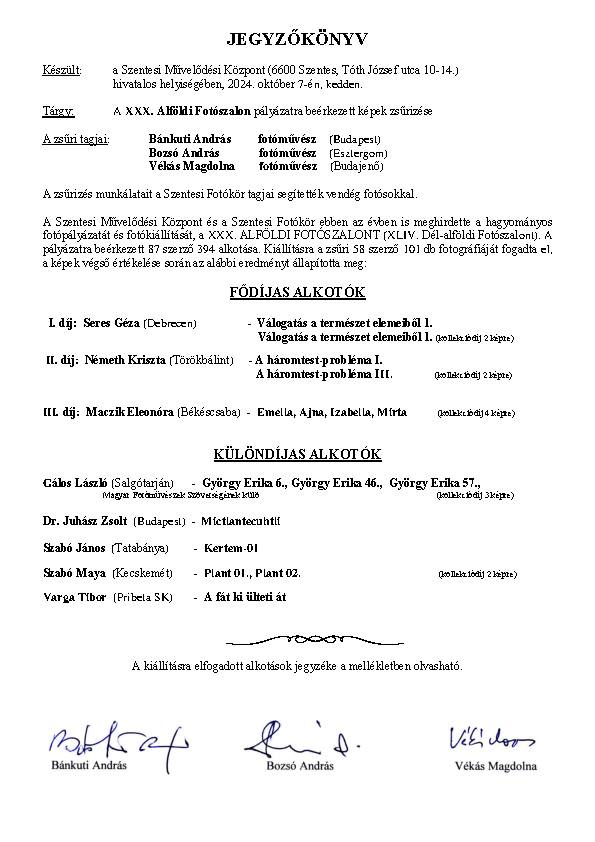 Megtörtént a zsűrizése október 7-én a XXX. Alföldi Fotószalonnak, ami egyben a XLIV. Dél-Alfoldi Fotószalon is. Mellékelem a képjegyzéket és a jegyzőkönyvet, ott megtalálhatók a kiállításra elfogadott alkotások a képjegyzékben felsorolva.