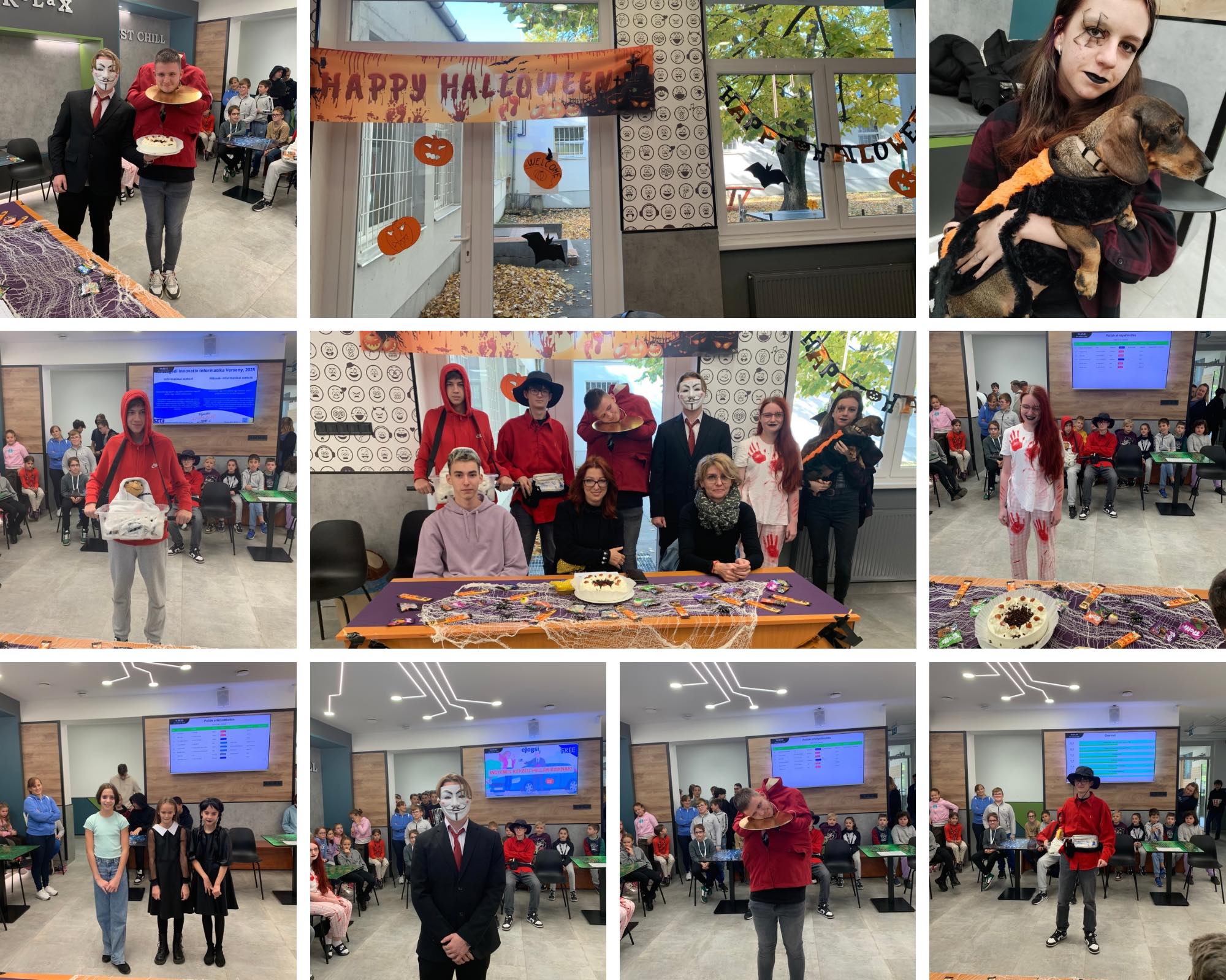 Az őszi szünet előtti utolsó napon felvonultak a “rémségek” iskolánkban, és a legötletesebb jelmez viselőjét a zsűri egy tortával jutalmazta. Különleges vendégeket is köszönthettünk: a Koszta József Általános Iskola 4. osztályos diákjai a pályaorientációs nap keretében részt vettek a rendezvényen.