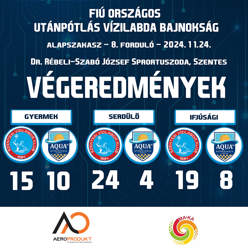 A Dr. Rébeli-Szabó József Városi Sportuszodában rendezték meg a korosztályos Fiú Utánpótlás Országos Bajnokság alapszakaszának 8. fordulóját. A MA-KA SZENTES, illetve az AEROPRODUKT SZENTES együttesei az AQUA SPORTEGYESÜLET NYÍREGYHÁZA csapatait látták vendégül. Sikeres napot zártak a hazaiak, szép játékkal kivétel nélkül győzelmet arattak.