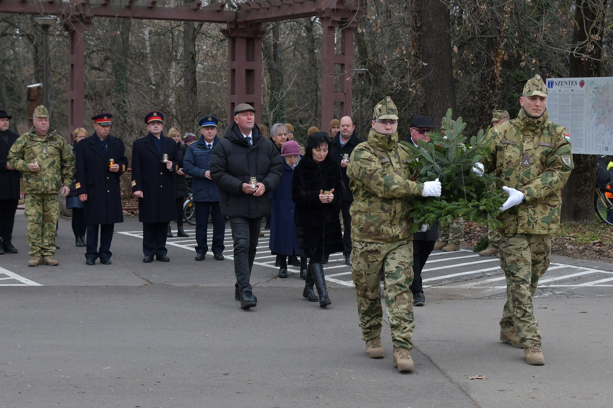A szentesi II. világháborús emlékműnél megtartott megemlékezésen a város vezetői, a helyi közösség tagjai, valamint az MH II. Rákóczi Ferenc 14. Műszaki Ezred katonái koszorúzással és gyertyagyújtással tisztelegtek a hősök előtt.