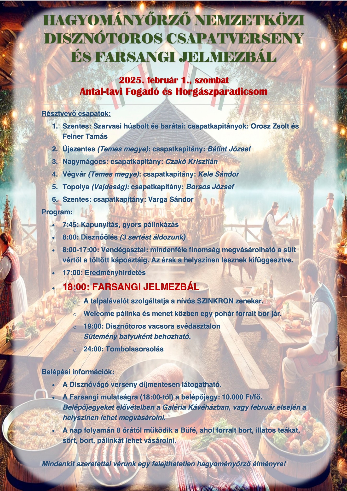2025. február 1-jén különleges gasztronómiai és kulturális élményekkel vár mindenkit az Antal-tavi Fogadó és Horgászparadicsom, amely nemzetközi disznótoros fesztiválnak és farsangi bálnak ad otthont. Az eseményen a dél-alföldi és határon túli ételkészítési hagyományok találkoznak, egyedi ízekkel és izgalmas programokkal kényezve a résztvevőket.