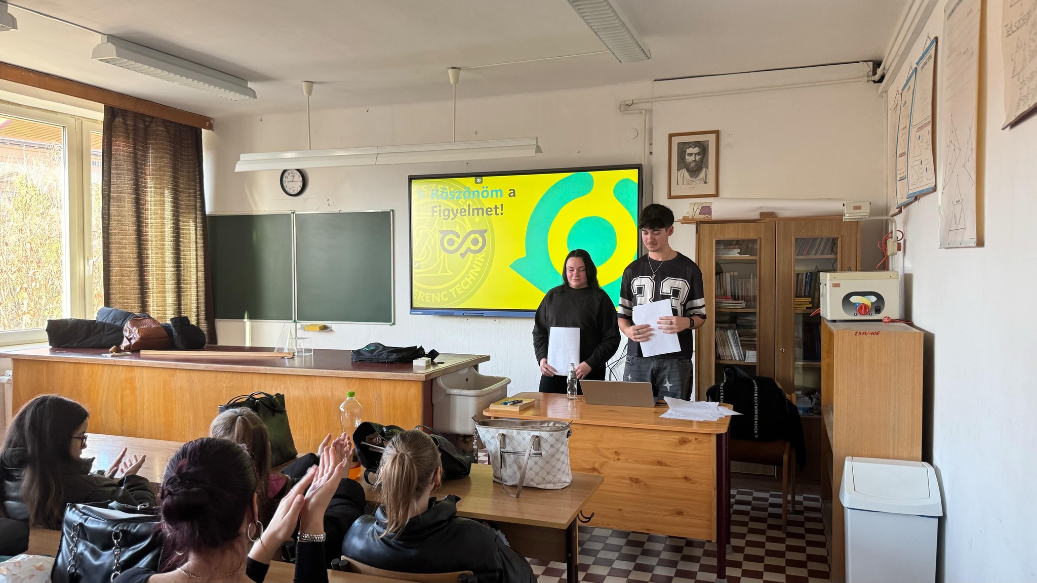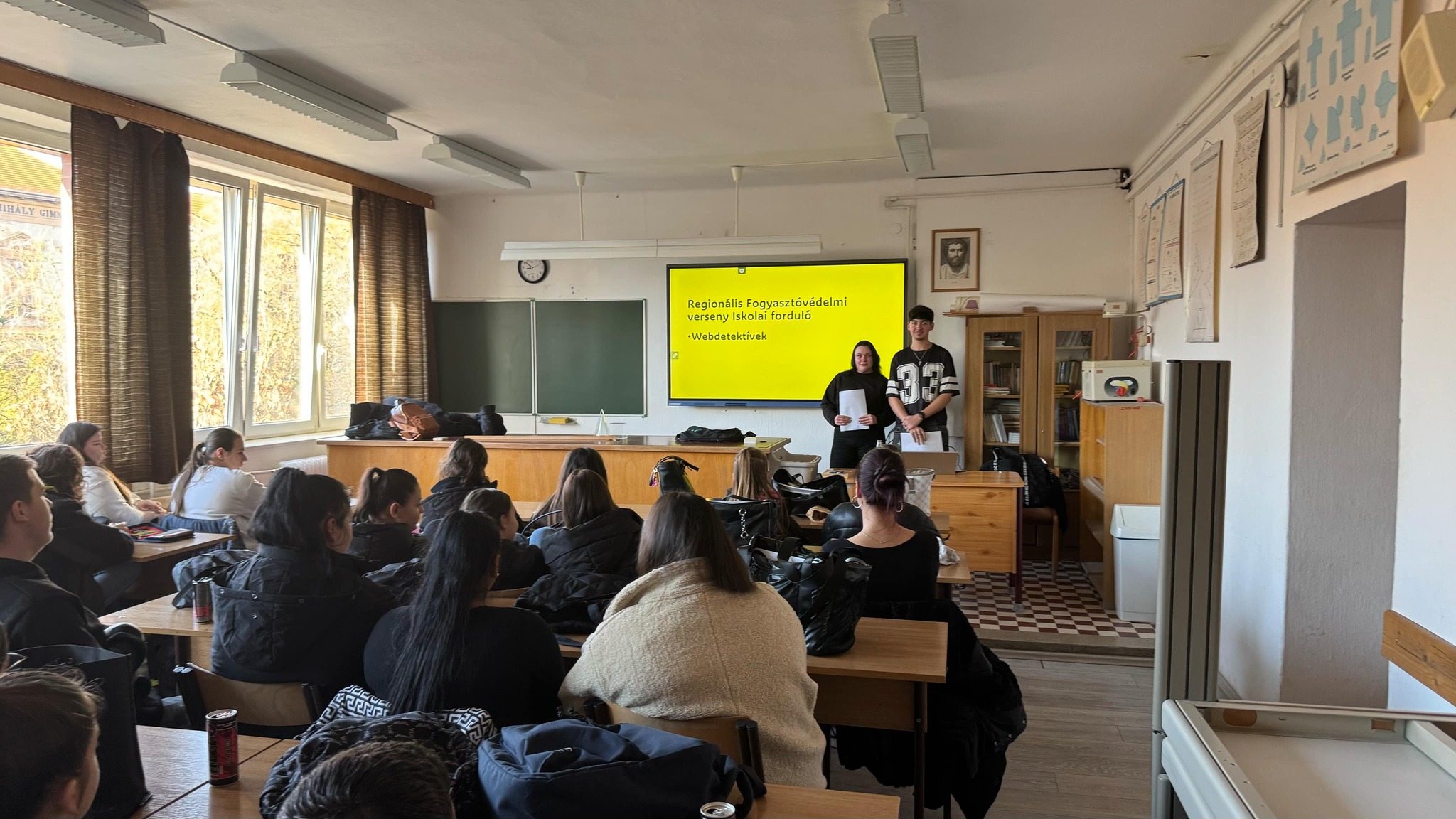 A 12.B kereskedő csoportjának tanulói a II. Nemzetközi Regionális Fogyasztóvédelmi Versenyre készülnek, amelynek első állomása a verseny iskolai fordulója 2025. január 29-én került megrendezésre iskolánkban. A versenyre két téma feldolgozásával: A palackvisszaváltó rendszer problémái, és Az internetes csalások, visszaélések aktualitásának elemzésével készülnek a tanulók.