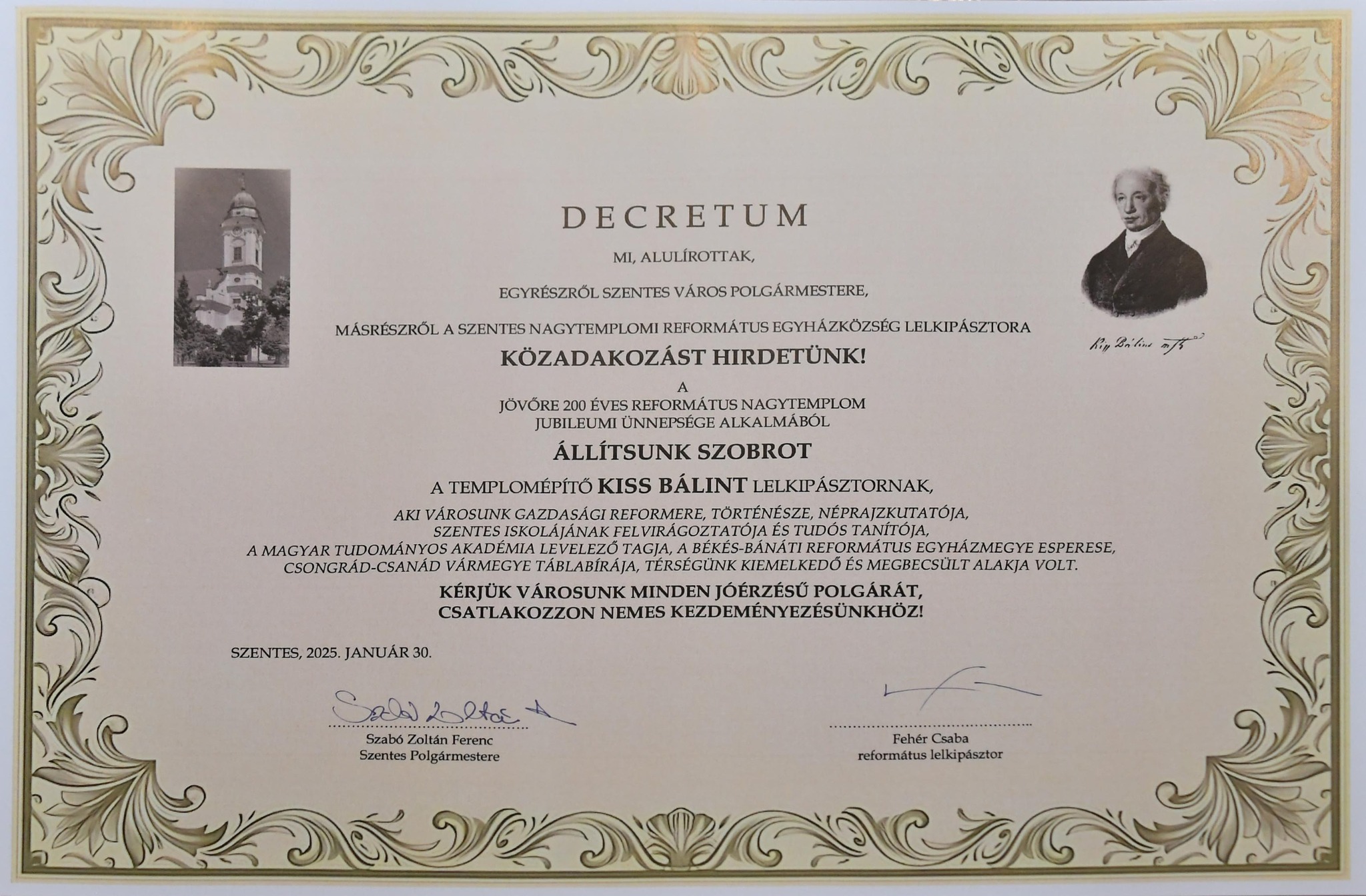 A város régi adósságát törlesztené azzal, ha szobrot állítana Kiss Bálintnak, a Szentes életében meghatározó református lelkipásztornak és polihisztornak. A Szentesi Nagytemplomi Református Egyházközség kezdeményezését az önkormányzat is támogatja.