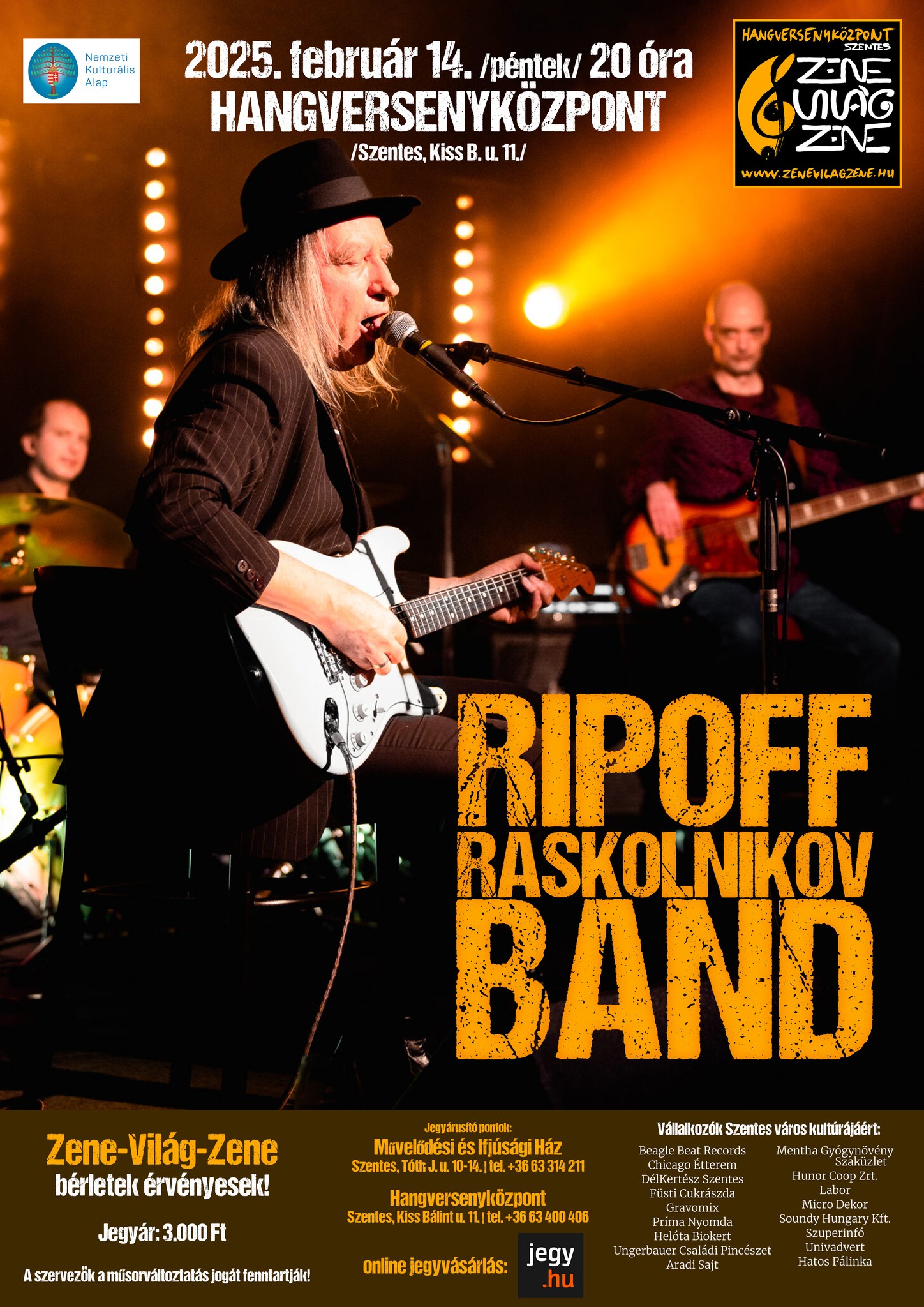 Zenekarával, a Ripoff Raskolnikov Banddel február 14-én 20 órakor lép a Hangversenyközpont színpadára. A ZVZ-bérletek érvényesek, jegyek válthatók: Művelődési és Ifjúsági Ház, Hangversenyközpont, jegy.hu.