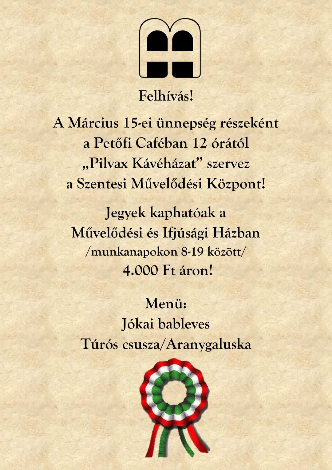 Örömmel értesítünk mindenkit, hogy a Március 15-ei ünnepség részeként a Petőfi Caféban megrendezésre kerül a „Pilvax Kávéház”! 🟥⬜🟩