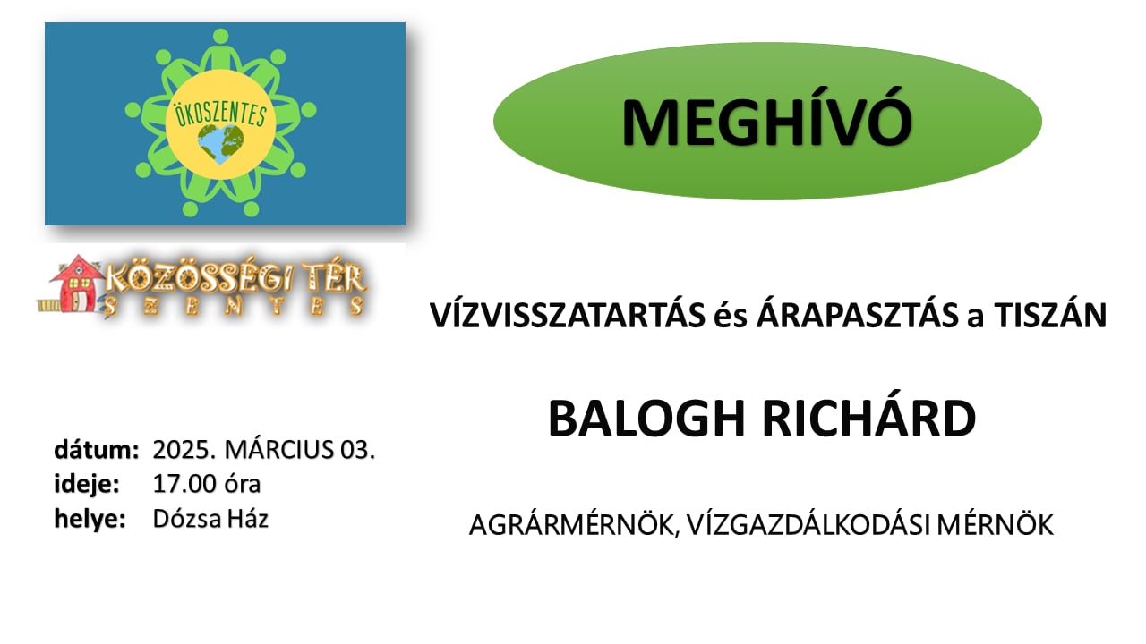 Szeretettel várunk minden érdeklődőt egy izgalmas és aktuális előadásra a Tisza vízgazdálkodásáról! Balogh Richárd agrármérnök és vízgazdálkodási mérnök bemutatja, hogyan lehet hatékonyan kezelni az árhullámokat és visszatartani a vizet a fenntartható jövő érdekében.