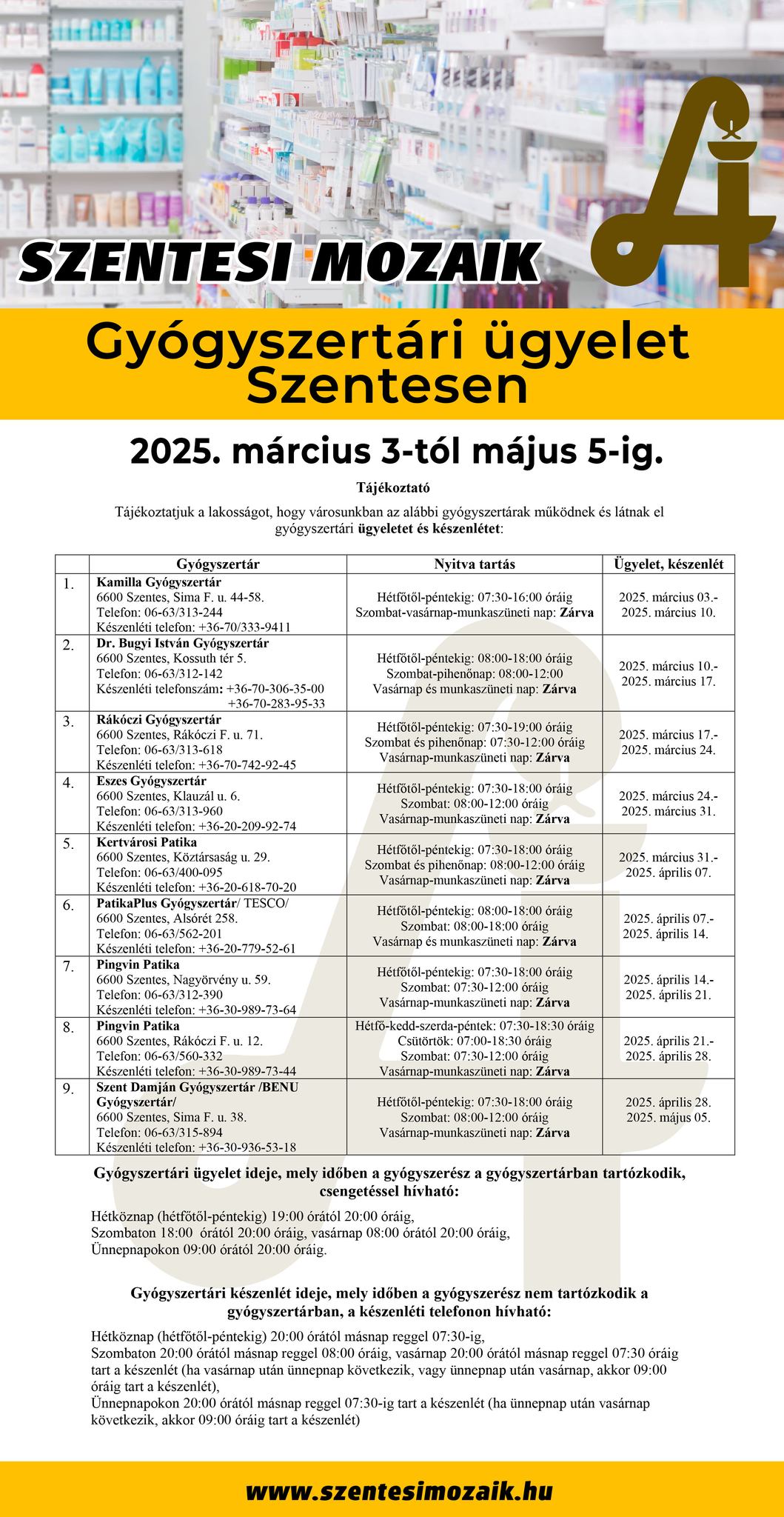 Gyógyszertári ügyelet 2025. március 03-tól 2025. május 05-ig Szentesen…