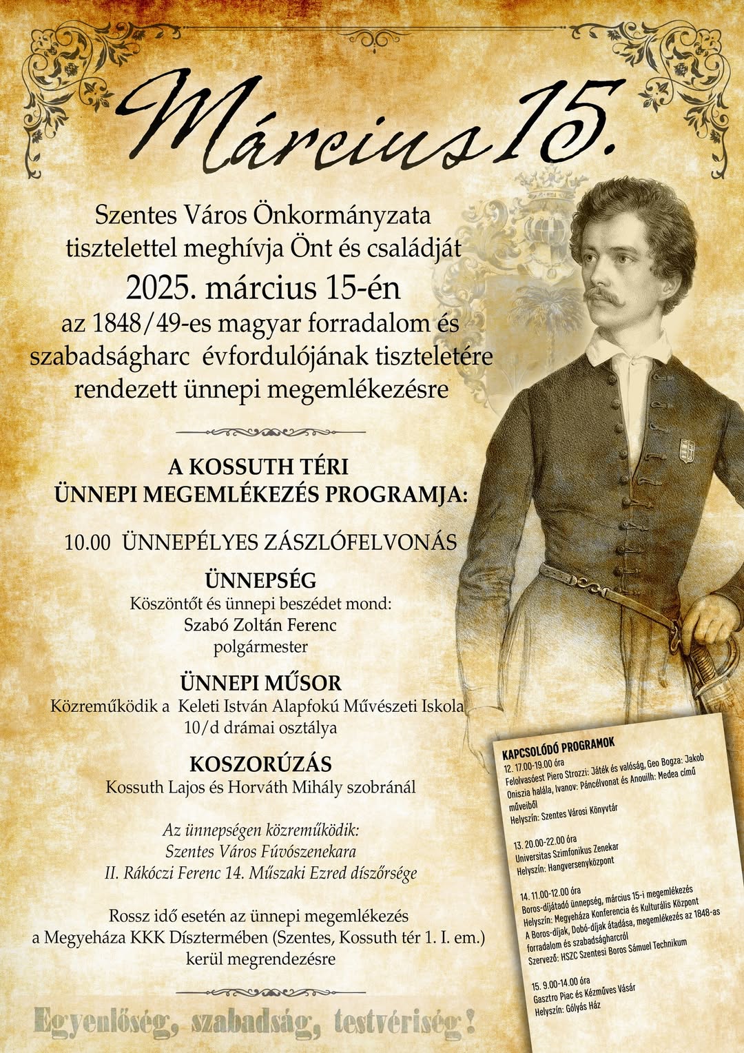 Szentes Város Önkormányzata tisztelettel meghívja Önt és családját az 1848/49-es magyar forradalom és szabadságharc évfordulójának tiszteletére rendezett ünnepi megemlékezésre. A rendezvény 2025. március 15-én kerül megrendezésre a Kossuth téren, ahol méltó módon emlékezhetünk meg nemzeti hőseinkről.