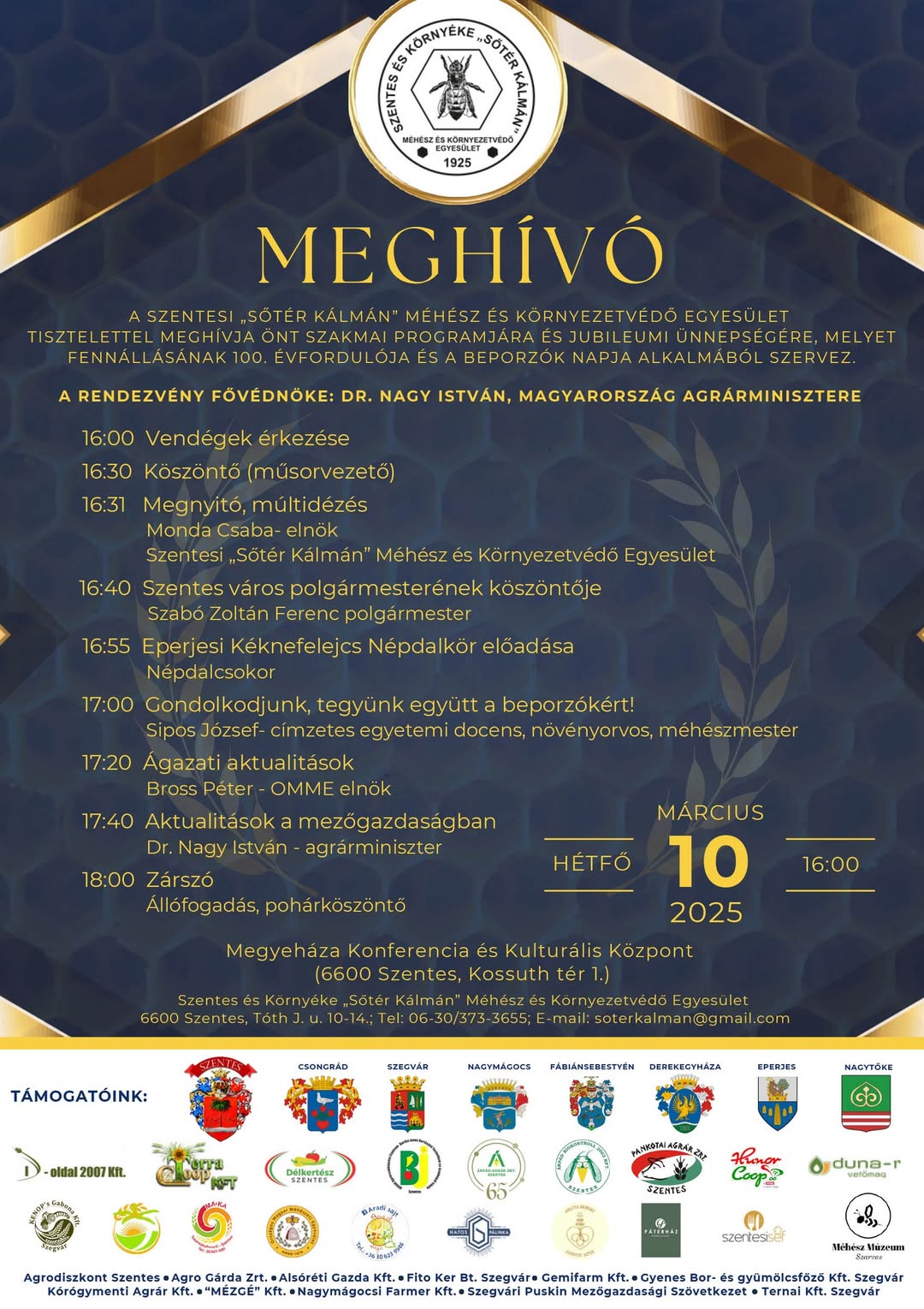 Az idén ünnepli fennállásának 100. születésnapját a Szentesi „Sőtér Kálmán” Méhész és Környezetvédő Egyesület. Az évfordulóról egy nagyszabású szakmai programmal és jubileumi ünnepséggel emlékeznek meg, melynek fővédnöke és egyik előadója Nagy István agrárminiszter.