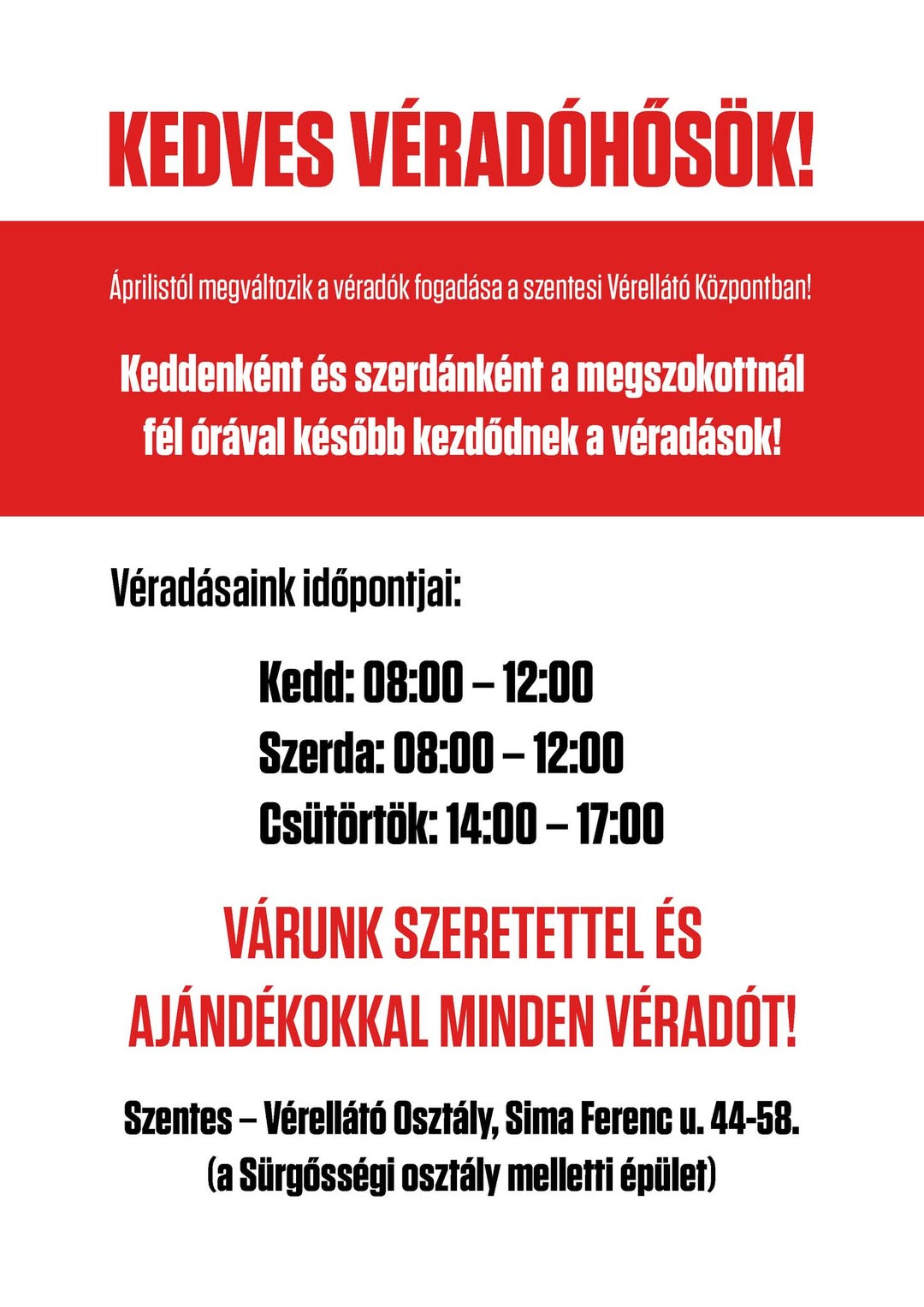 Áprilistól megváltozik a véradók fogadása a szentesi Vérellátó Központban, keddenként és szerdánként a megszokottnál fél órával később kezdődnek a véradások!