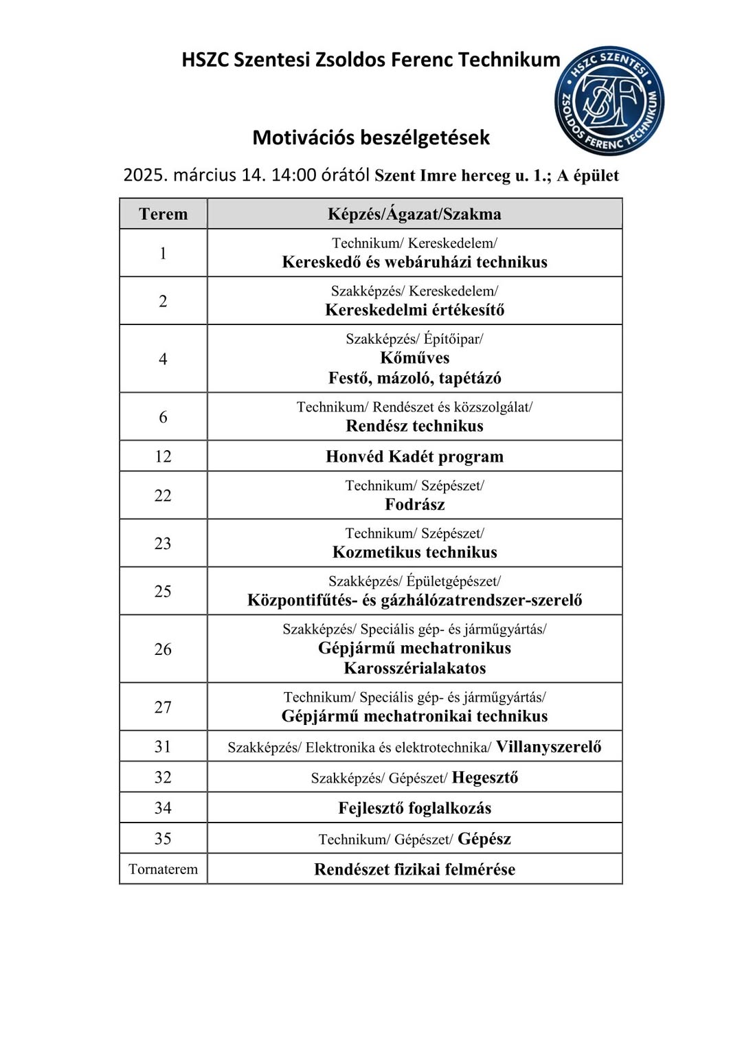 Szeretettel várjuk az intézményünkbe jelentkező diákokat egy egyéni motivációs beszélgetésre. A helyszínen tájékoztatást kapnak a választott technikumi és szakmai képzésről. Várjuk a kedves szülőket is, akik találkozhatnak a gyermeküket tanító oktatókkal. A helyszínen választ kaphatnak konkrét kérdéseikre.