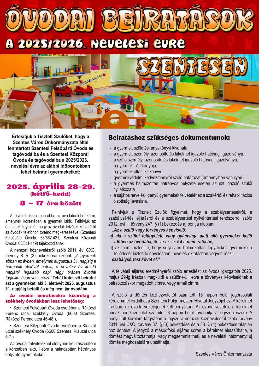 Értesítjük a Tisztelt Szülőket, hogy a Szentes Város Önkormányzata által fenntartott Szentesi Felsőpárti Óvoda és tagóvodáiba és a Szentesi Központi Óvoda és tagóvodáiba a 2025/2026. nevelési évre az alábbi időpontokban lehet beíratni gyermekeiket: