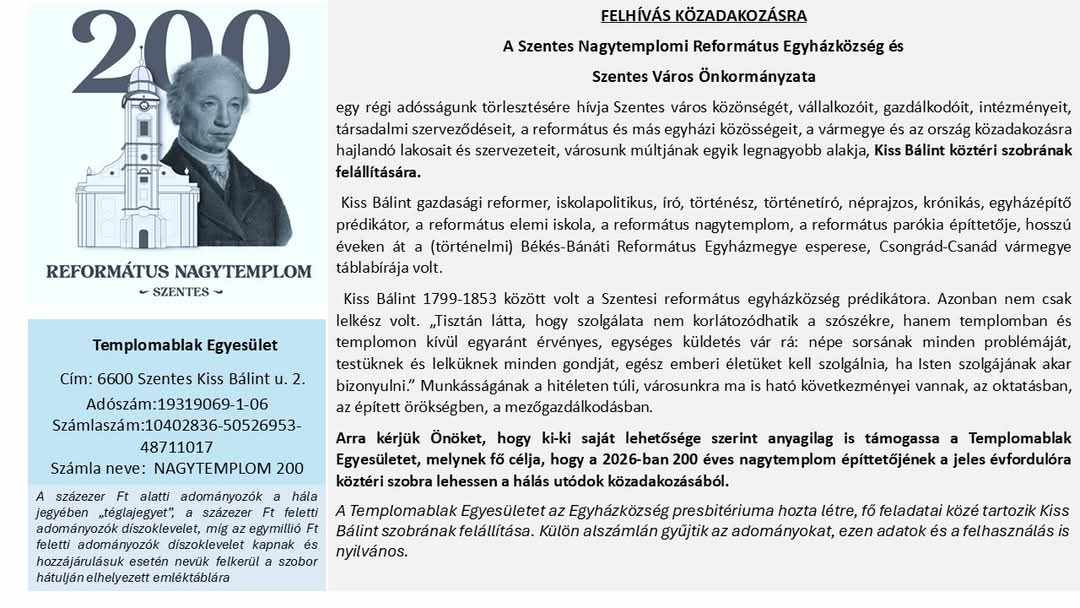Jövőre lesz 200 éves a Református Nagytemplom, a jubileumnak a Szentes Nagytemplomi Református egyházközség elgondolása szerint méltó megünneplése lenne egy köztéri szobor felállítása Kiss Bálint tiszteletére. Ennek érdekében közadakozást hirdet a Szentes Nagytemplomi Református Egyházközség és az önkormányzat.
