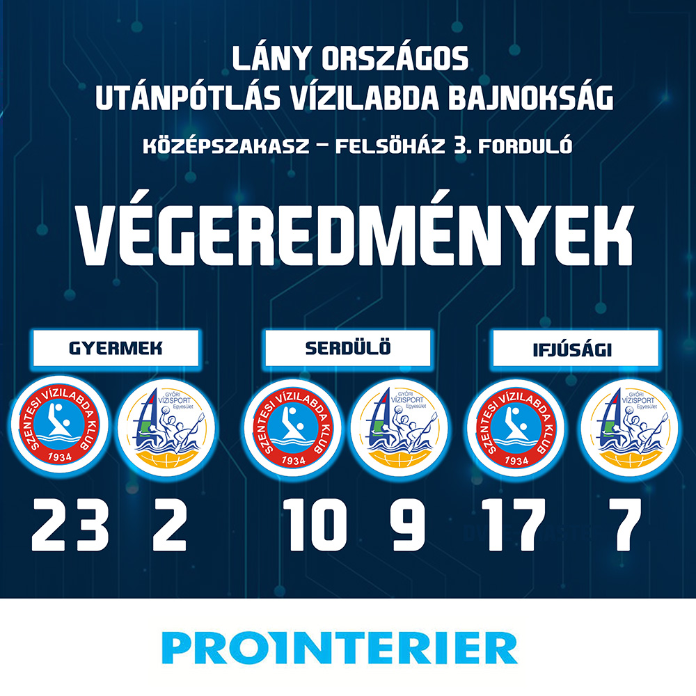 Március 30-án, vasárnap a Dr. Rébeli-Szabó József Városi Sportuszoda adott otthont a Lány Utánpótlás korosztályos OB középszakasza újabb fordulójának. A Prointerier Szentes csapatai a GYVSE UNI-GYŐR együtteseit fogadták. Az alapszakaszt követően újra összecsapott a két csapat, ez alkalommal mindhárom mérkőzésen begyűjtötték a 3 pontot Tóth Csenge és Tóth Gyula tanítványai.