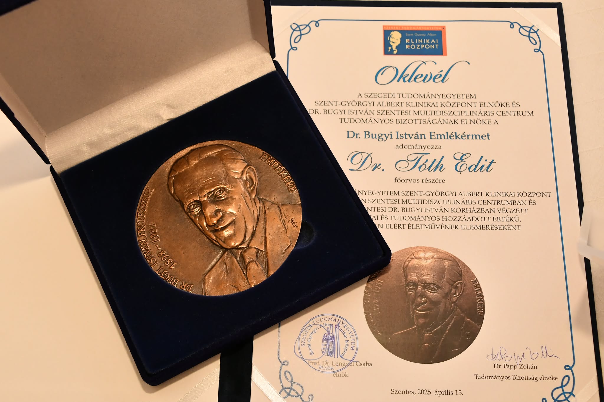 A Szegedi Tudományegyetem Szent-Györgyi Albert Klinikai Központ elnöke és a Dr. Bugyi István Szentesi Multidiszciplináris Centrum tudományos bizottságának elnöke a Dr. Bugyi István Emlékérmet adományozta dr. Tóth Edit főorvos részére a magas szakmai és tudományos hozzáadott értékű, a gyógyításban elért életművének elismeréseként, melyet április 15-én tudományosülésen vehetett a Megyeháza Konferencia és Kulturális Központ dísztermében. A díjat Prof. Dr. Lengyel Csaba, az SZTE SZAKK elnöke, dr. Sümegi Viktória és dr. Papp Zoltán, az SZTE SZAKK Szentesi Multidiszciplináris Centrum főorvosa adta át.