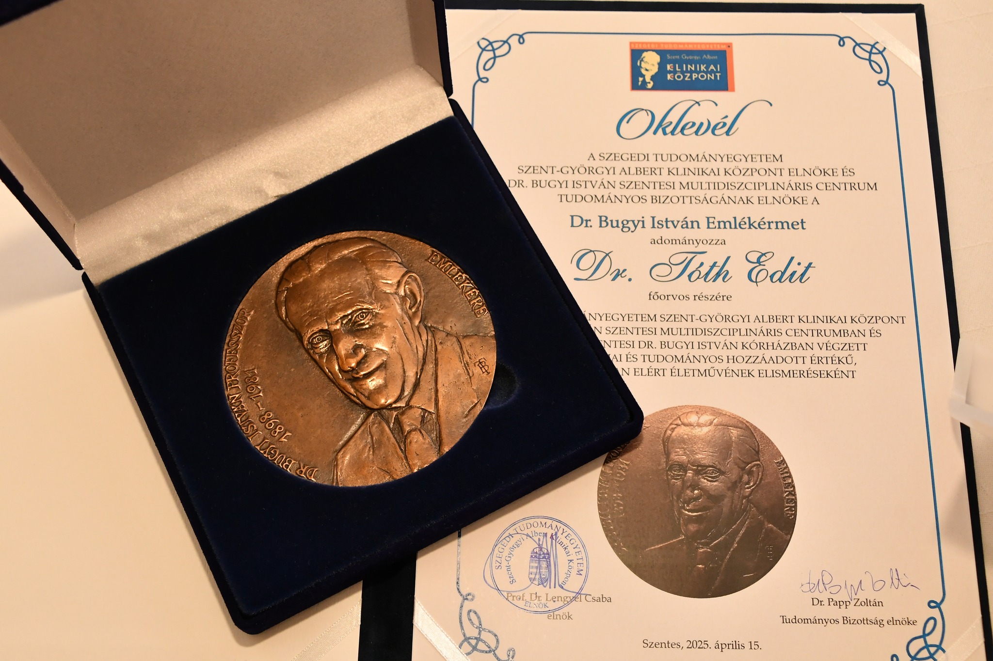 A Szegedi Tudományegyetem Szent-Györgyi Albert Klinikai Központ elnöke és a Dr. Bugyi István Szentesi Multidiszciplináris Centrum tudományos bizottságának elnöke a Dr. Bugyi István Emlékérmet adományozza Dr. Tóth Edit főorvos részére a Szegedi Tudományegyetem Szent-Györgyi Albert Klinikai Központ Dr. Bugyi István Szentesi Multidiszciplináris Centrumban és a jogelőd Szentesi Dr. Bugyi István Kórházban végzett magas szakmai és tudományos hozzáadott értékű, a gyógyításban elért életművének elismeréseként, melyet a mai tudományosülésen vehetett a Megyeháza Konferencia és Kulturális Központ dísztermében.