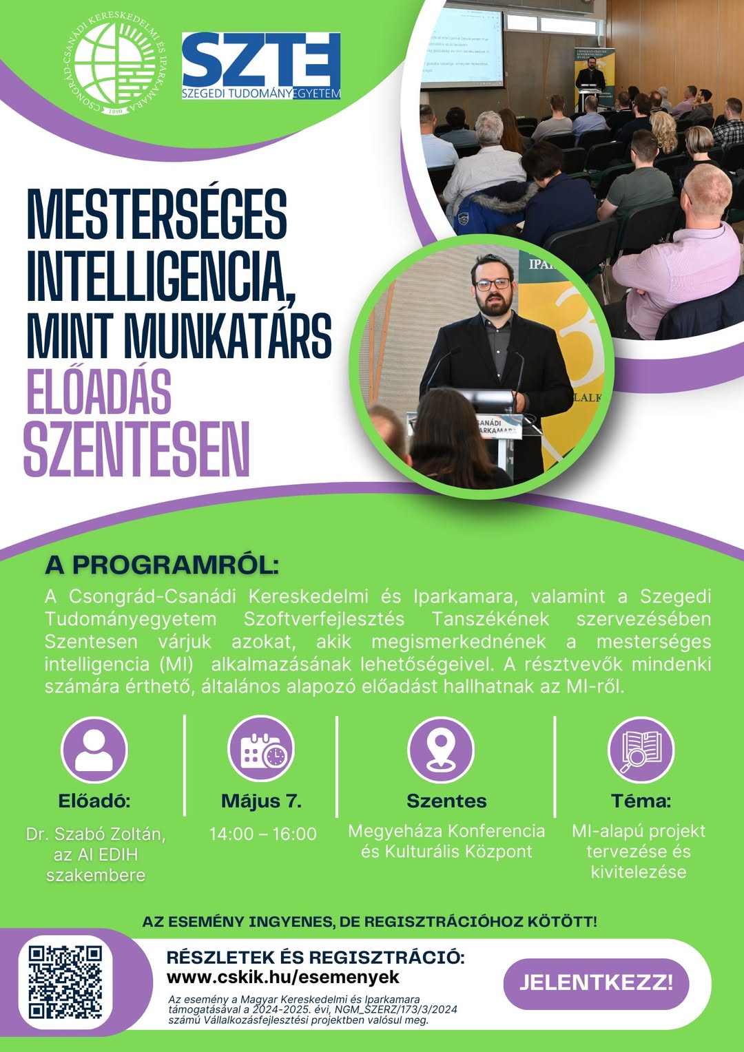 2025-ben is folytatjuk a tudásbővítést a Mesterséges Intelligenciával. A Szegedi Tudományegyetem Szoftverfejlesztési Tanszéke és a Csongrád-Csanádi Kereskedelmi és Iparkamara szervezésében a Pince Akadémia kurzusok keretében nagy sikerű előadások hangzottak el a Mesterséges Intelligencia nyújtotta lehetőségekről a 2024-es évben. A Szoftverfejlesztési Tanszék munkatársai a nagy nyelvi modellek, az MI alapú intelligens adatelemzés, gépi látás segítségével történő optimalizálás, és az MI segítségével működő ügyvitel automatizálás világába vezették be a résztvevőket. Az előadások célja, hogy valós példákon keresztül mutassák meg az MI alkalmazásokat. A korábbi sikerekre való tekintettel 2025 tavaszán Szentesen is szervezünk intenzív oktatást a Szoftverfejlesztési Tanszékkel együttműködve.