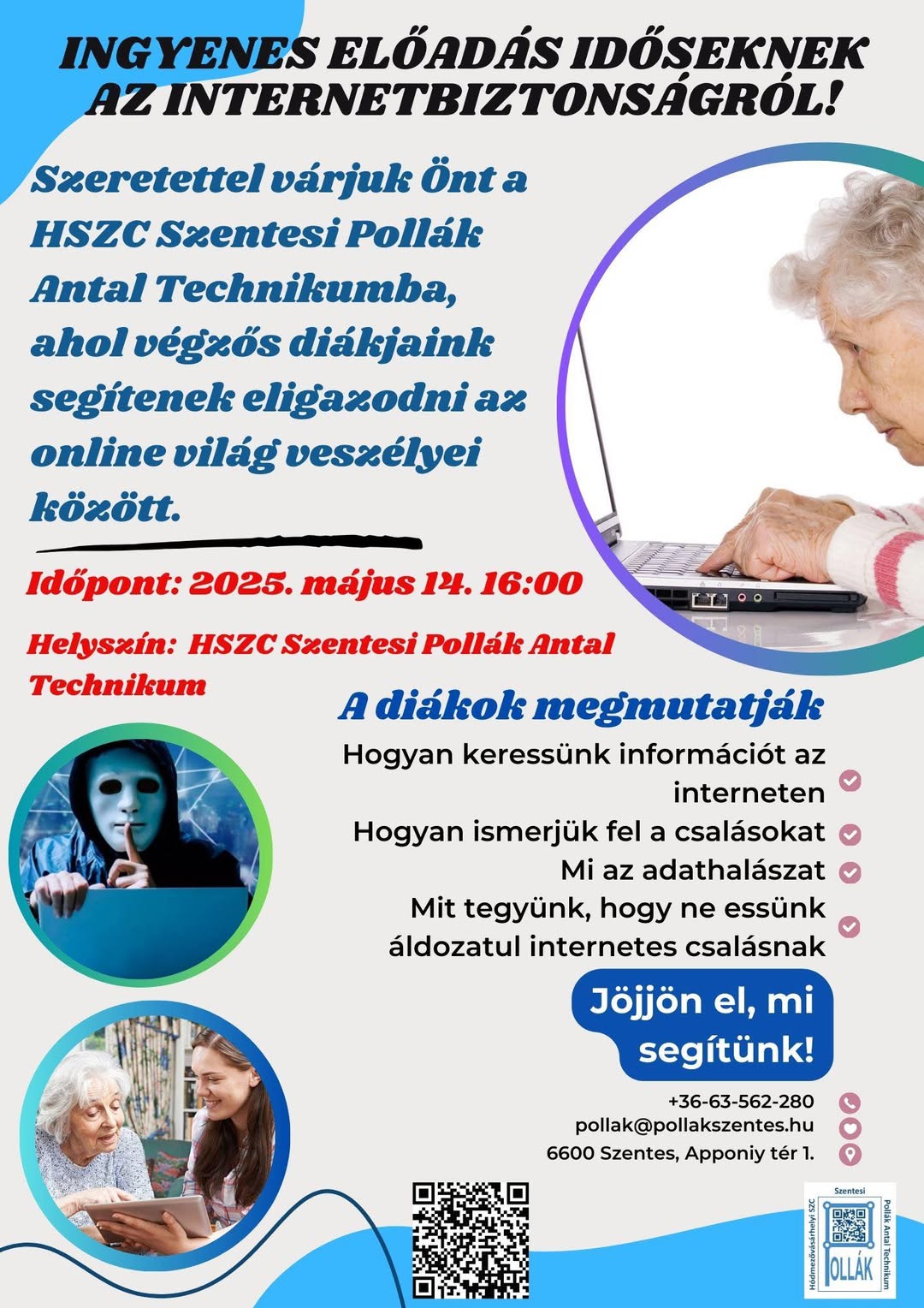 Kedves idős FB-követőink! Ha Önök a szentesi városközpontban vagy a Felsőpárton élnek, és szívesen meghallgatnák 13. évfolyamos, informatika szakos diákjaink előadását az online világ titkairól, szeretettel várjuk Önöket a Pollákban, az Apponyi téren! Az első alkalom május 14-én, szerdán 16 órakor lesz, de szívesen folytatjuk az érdekes téma körüljárását egy következő időpontban is. Beszélgessünk egy jót, tegyük lehetővé a generációk találkozását! 🧑🏻🦳👨🏻🦳👱🏻♀️🧑🏻🦱