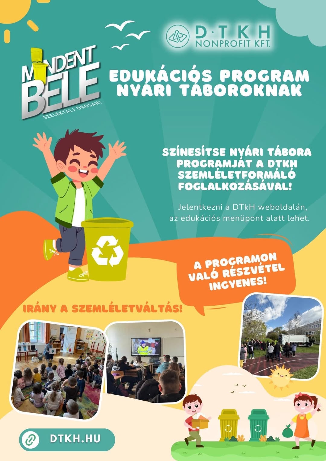 A DTKH Nonprofit Kft. edukációs csapata a tanév befejeztével sem tart szünetet a szemléletformálásban. A 2025 tavaszán indított „Mindent bele! Szelektálj okosan!” elnevezésű kampány keretében a nyári hónapokban is folytatják a munkát, ezúttal nyári táborok helyszínein, fesztiválokon és egyéb rendezvényeken kínálva interaktív, játékos foglalkozásokat a gyermekek számára.
