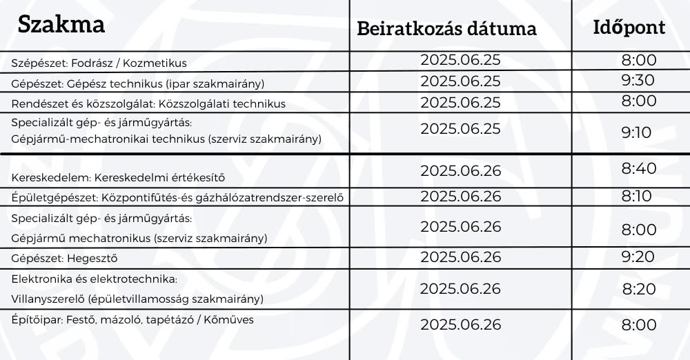 8. osztályos tanulóknak az alábbi szakmákra történő beiratkozás a megadott időpontokban.
