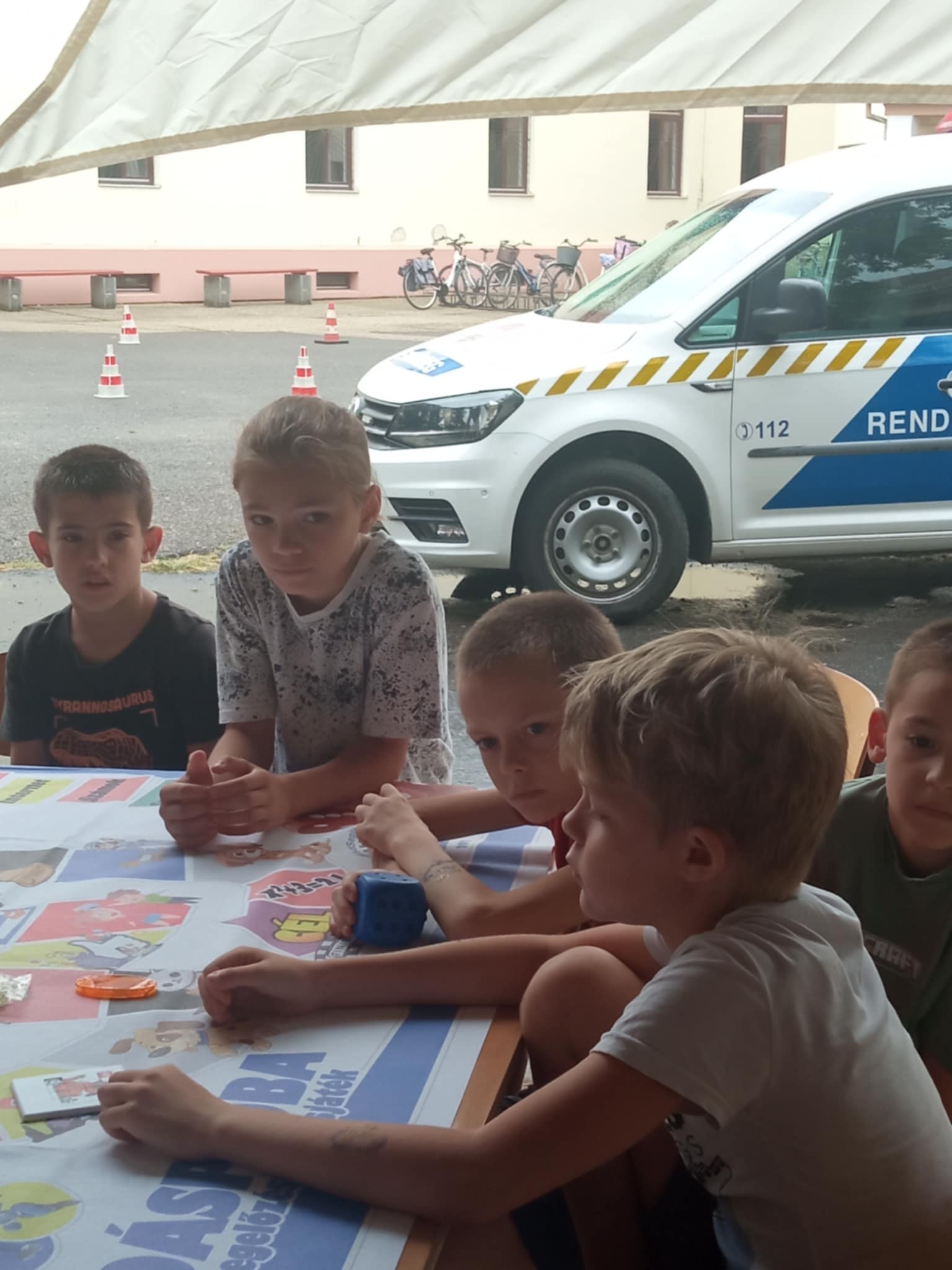 A rendőrség kötelékéből Pengő Erzsébet bűnmegelőzési előadó, Bányai Gábor baleseti helyszínelő érkezett a rendőrségi programunkra, Szenti Patrícia iskolaőr kíséretében. A Bányai Gábor által épített közlekedési akadálypályát rollerrel és gyalogosan is bejárták a gyerekek, az ott szerzett ismereteiket a közlekedési okostársasjátékban kiválóan kamatoztatták.