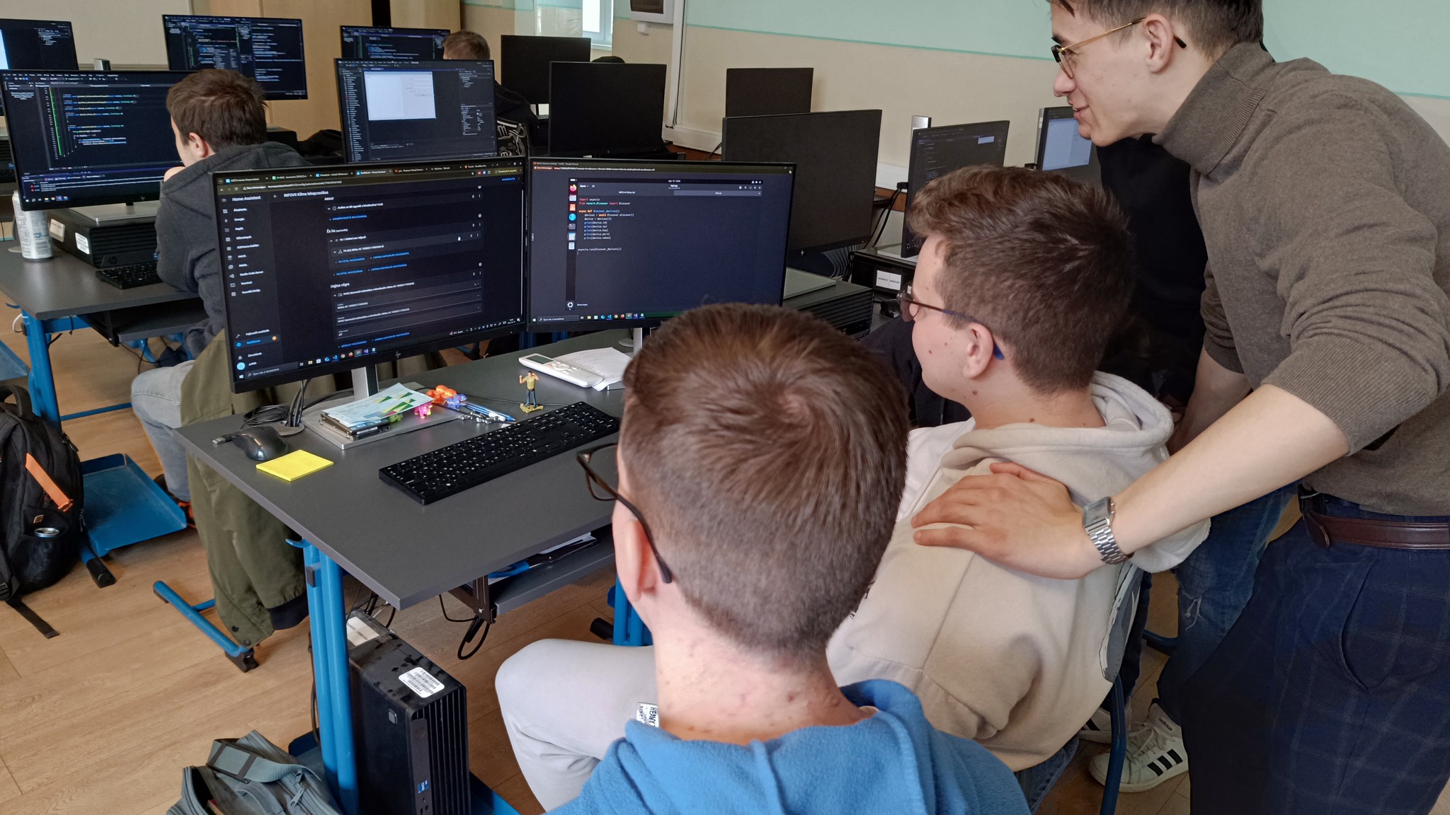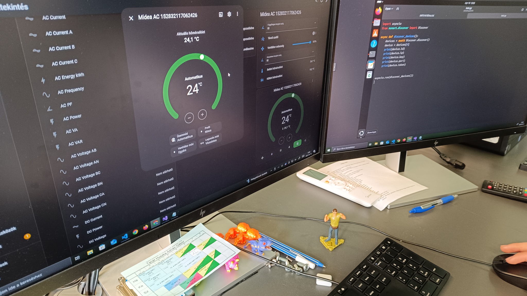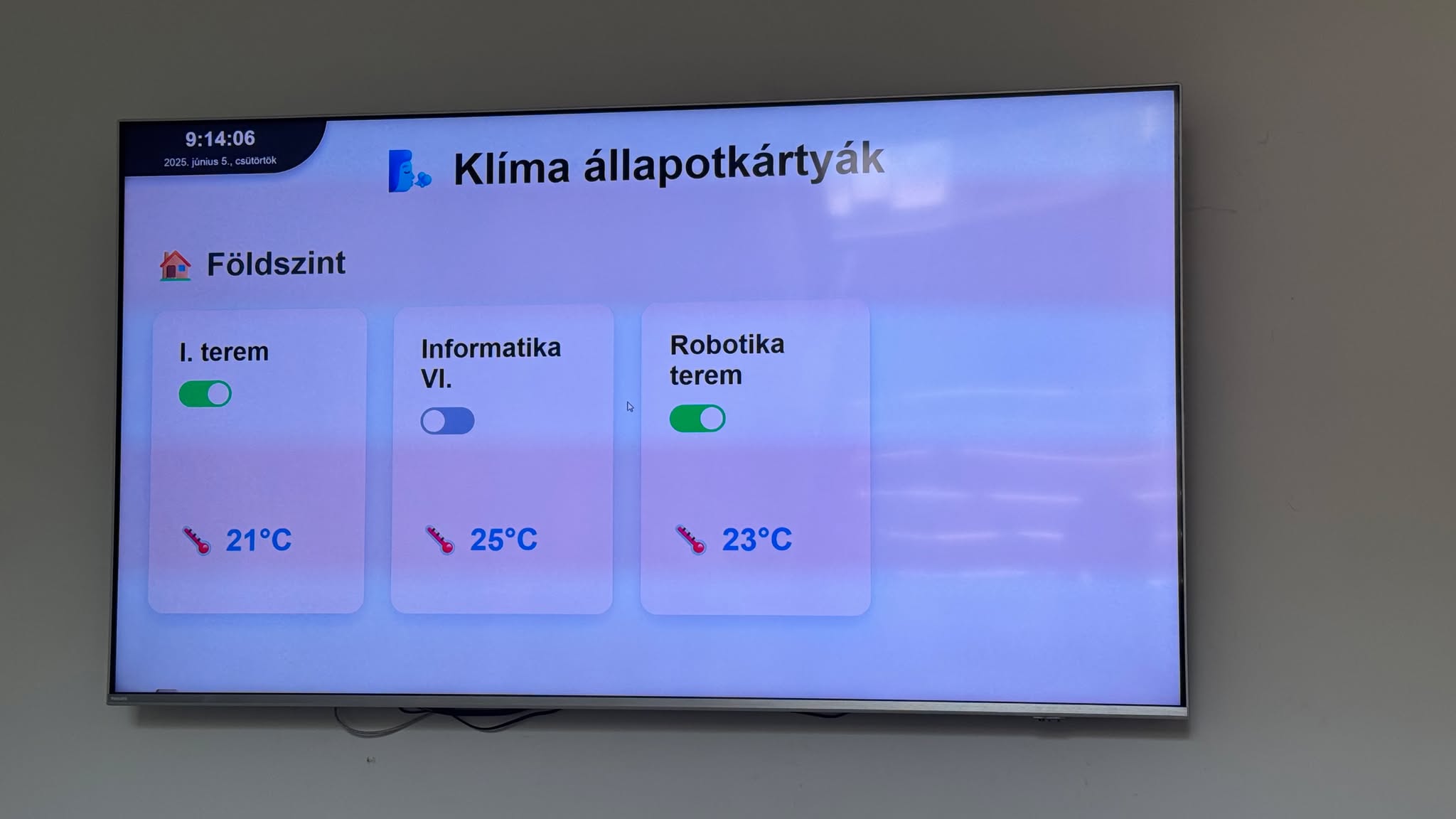 Még áprilisban, a Fenntarthatósági Témahét keretén belül hírt adtunk arról, hogy a 12.AB egyik szoftverfejlesztő csoportja elkészítette a programot az iskolai klímák automatikus vezérléséhez Huszka Adrián és Vincze Mihály irányításával. Így május-június hónapban már az épület földszintjén és 1. emeletén megvalósult az az innováció, hogy a tantermekben reggel automatikusan bekapcsoltak, délután pedig kikapcsoltak a légkondicionálók, törekedve az energiatakarékos megoldásra. A közösségi terekben elhelyezett okos TV-ken pedig mindenki követhette az aktuális helyzetet.