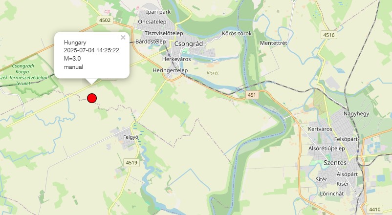 2025. július 4-én, pénteken délután 14:25-kor földrengést észleltek Csongrád közelében. A seismology.hu adatai szerint a földmozgás 3,0-as magnitúdójú volt, és mintegy 15 kilométeres mélységben keletkezett. Az epicentrum nagyjából 5 kilométerre délnyugatra helyezkedett el Csongrádtól.