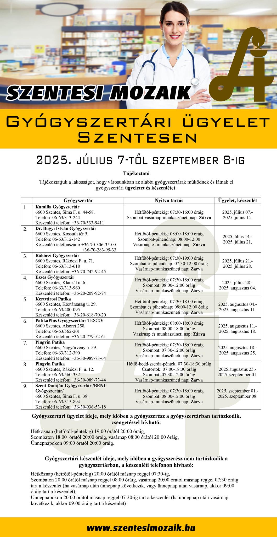 A nyári hónapokban is biztosított a gyógyszerellátás Szentesen: 2025. július 7-től szeptember 8-ig kilenc helyi gyógyszertár lát el heti váltásban ügyeleti és készenléti szolgálatot. A Szociális Iroda tájékoztatása szerint a gyógyszerészek biztosítják a sürgős gyógyszerkiváltás lehetőségét hétköznap esténként, valamint hétvégéken és ünnepnapokon is.