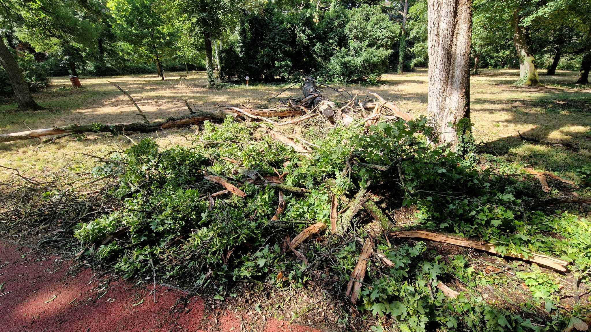 A Széchenyi-ligetben a futópályán egy hatalmas fatörzs fekszik, amelynek a gyökere a földben maradt.