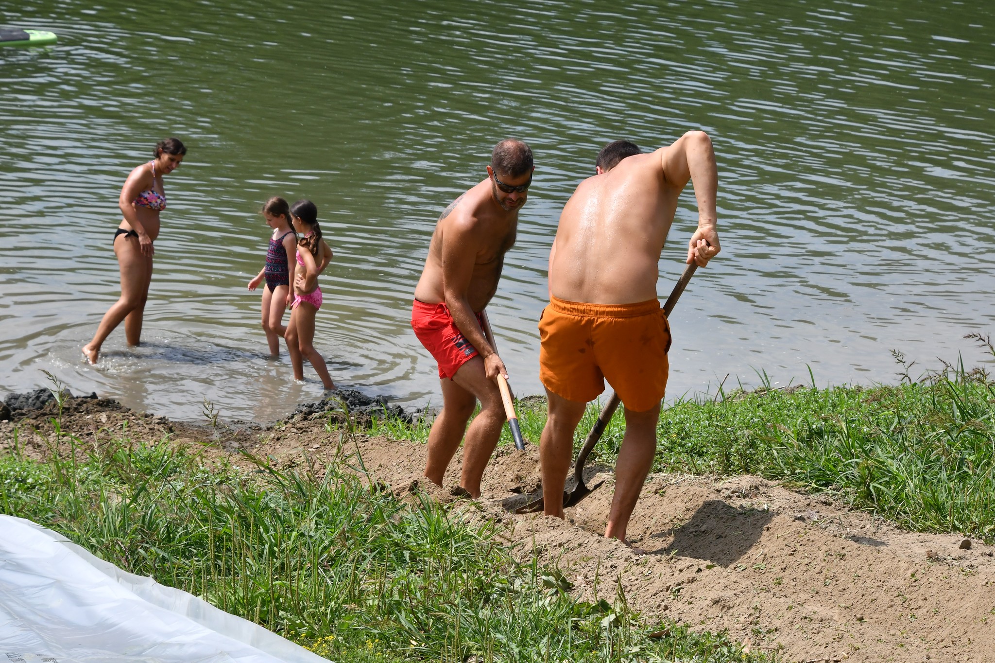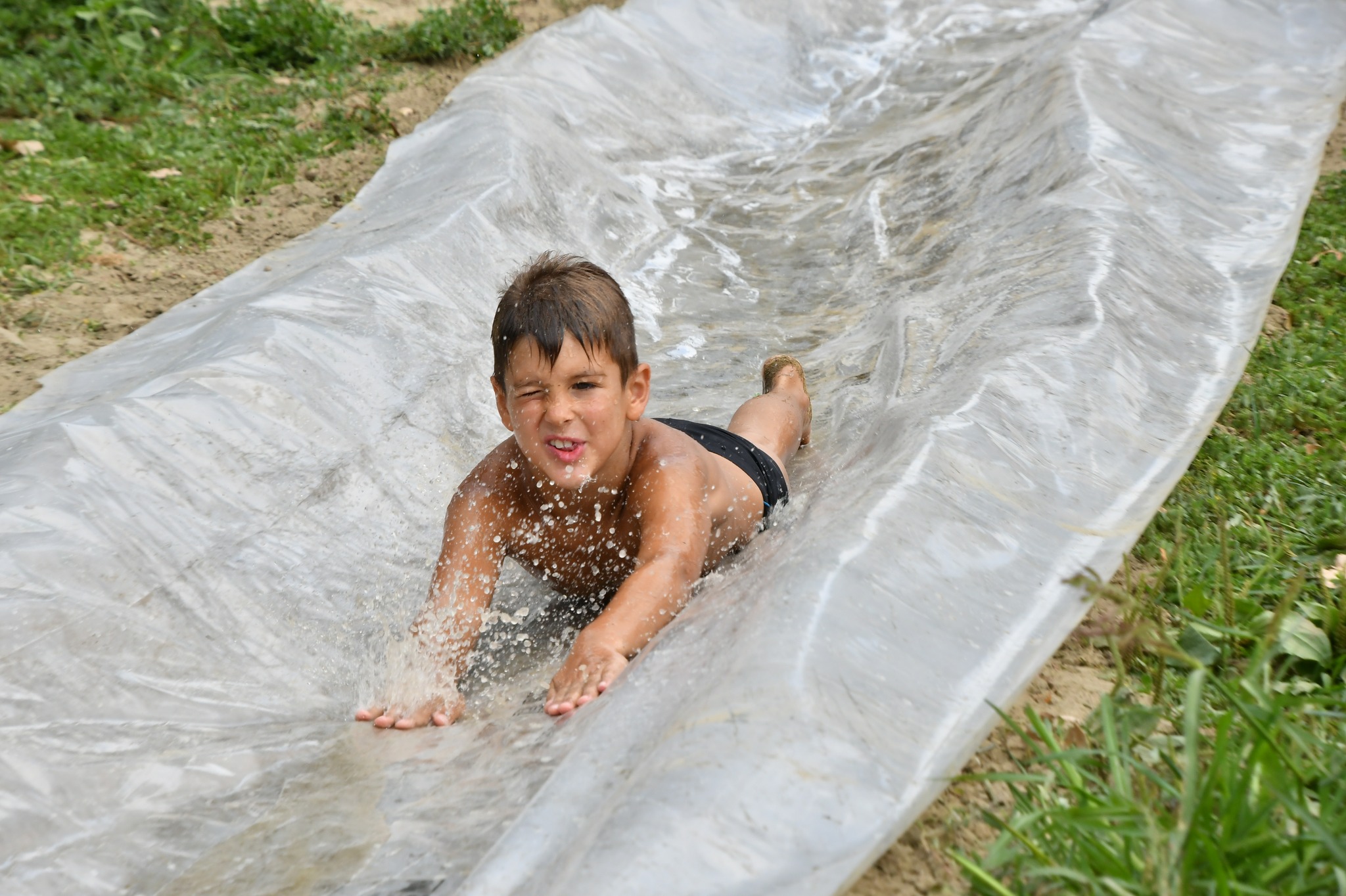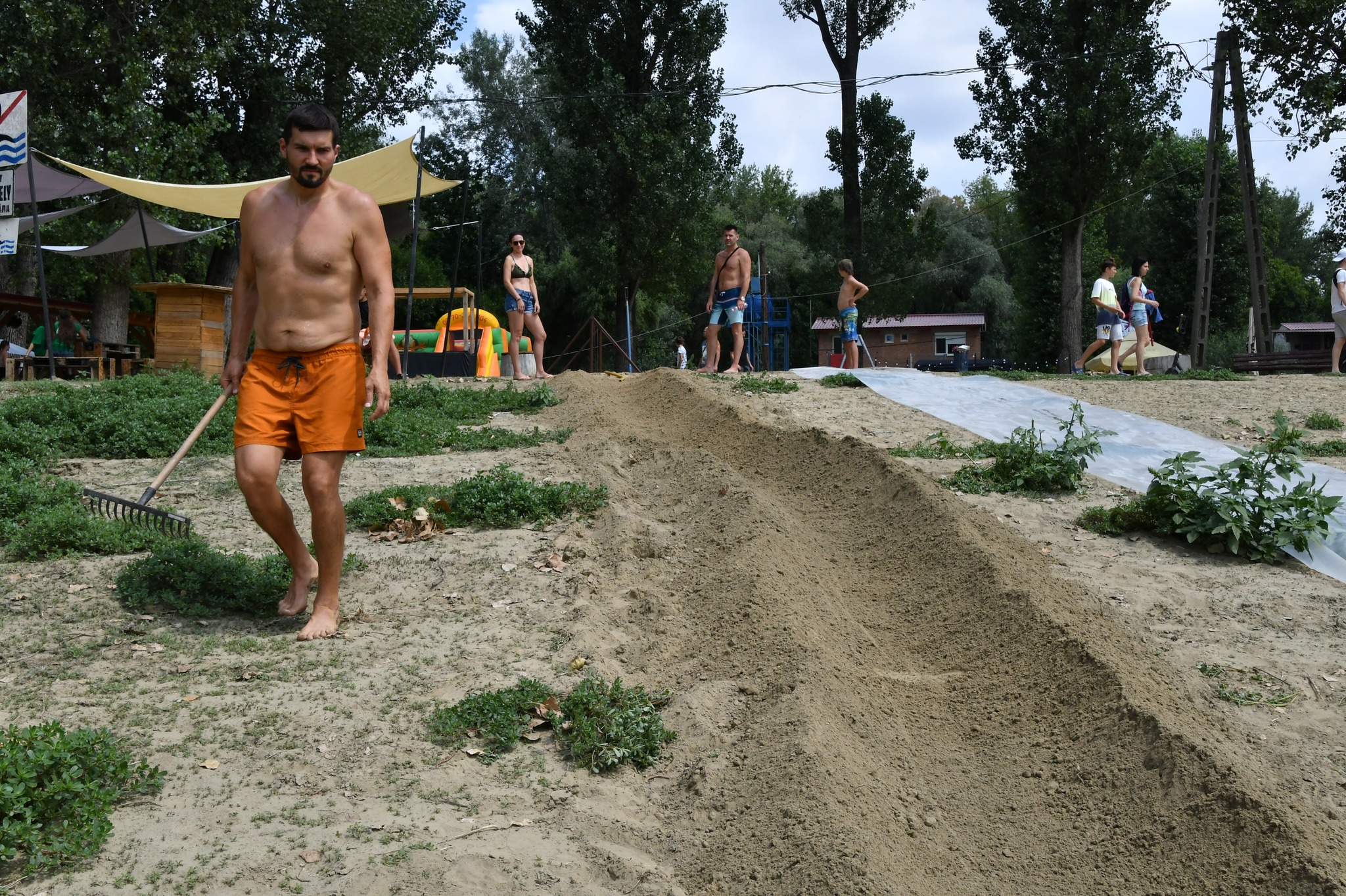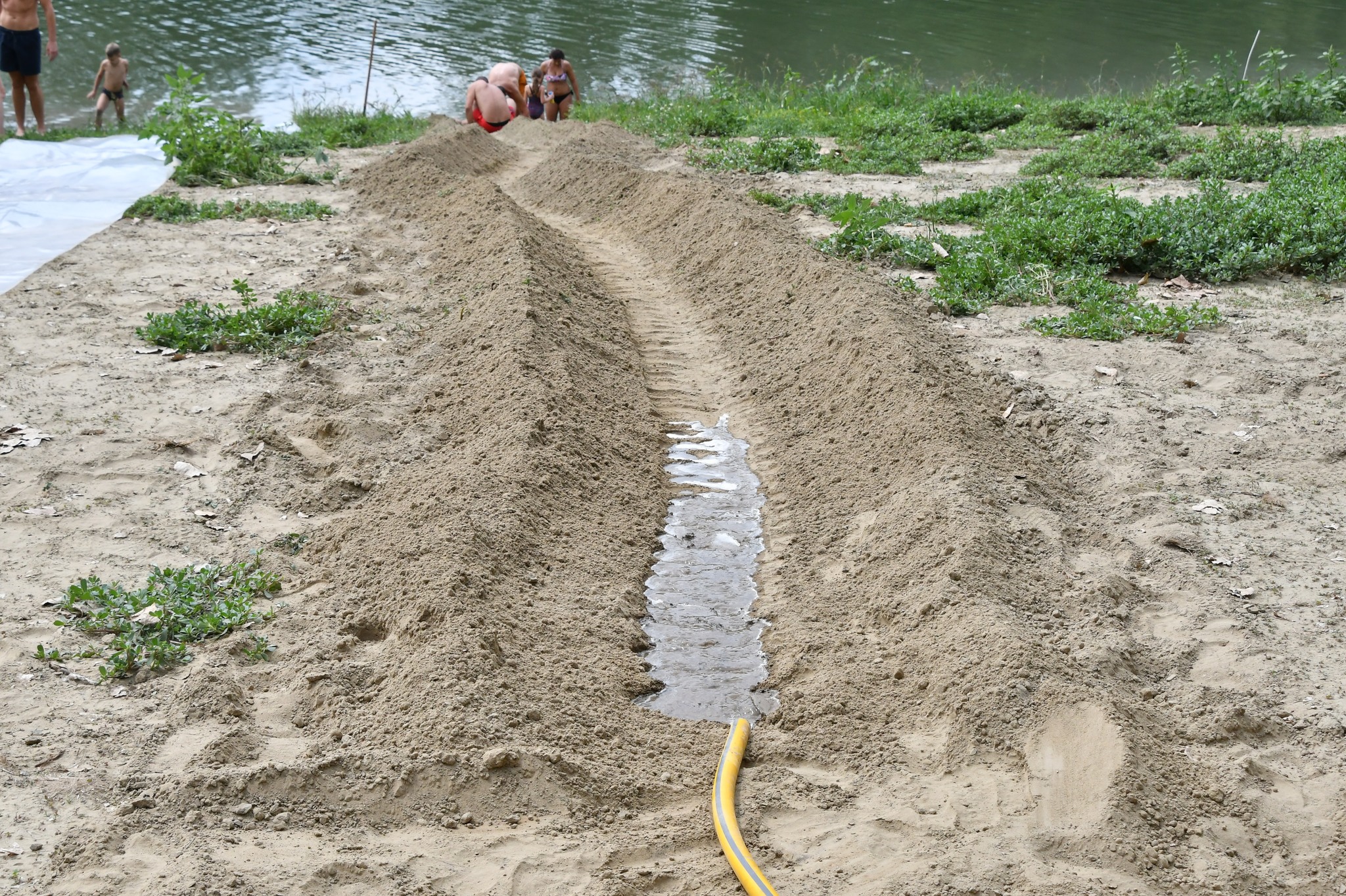 A régi iszapcsúszdák emlékét idézve – de annál picit modernebben – nejlonnal borított „gerilla” csúszda készült, amelyhez a lyukas nejlonszatyor és az ártézi kútból folyó hűs víz is elengedhetetlen volt. A strandolók maguk is beálltak segíteni, így délre már készen is volt a csúszda, ahonnan egyenesen a Tiszába lehetett belecsobbanni. 🌊