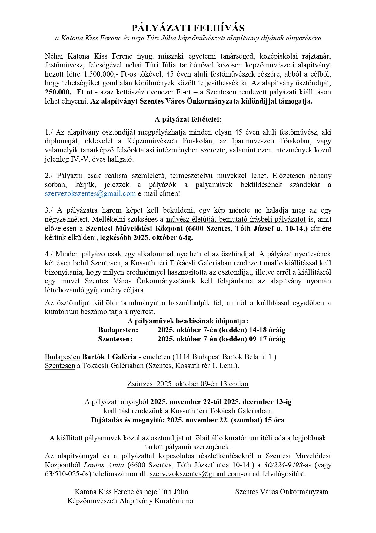 A Szentesi Múvelődési Központ ismét meghirdeti rangos és hagyományos pályázatát, a Katona Kiss Ferenc és neje Túri Júlia Képzőművészeti Alapítvány ösztöndíjára.
