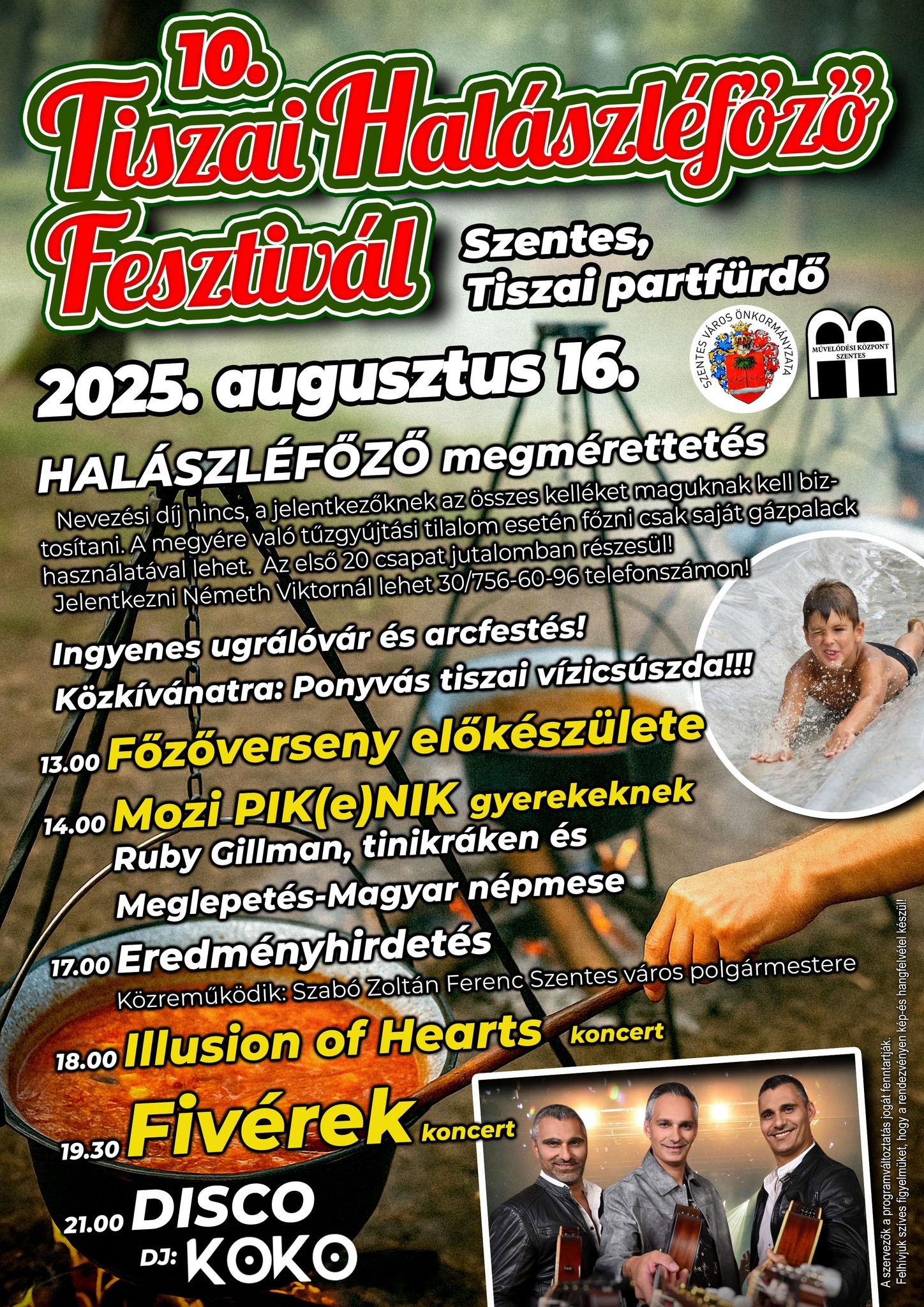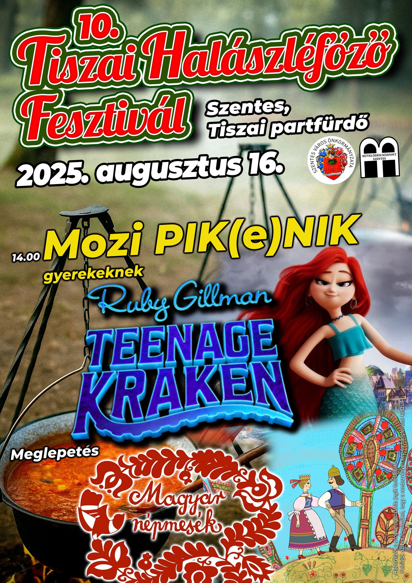 A nap folyamán ingyenes ugrálóvár és arcfestés várja a gyerekeket, valamint a közönség kedvenc Ponyvás tiszai vízicsúszdája is újra üzemel. 13 órától kezdődnek a főzőverseny előkészületei, majd 14 órakor Mozi PIK(e)NIK program gyerekeknek, ahol a Ruby Gillman, tinikráken című animációs film és egy meglepetés magyar népmese kerül vászonra a Szentes TV jóvoltából.