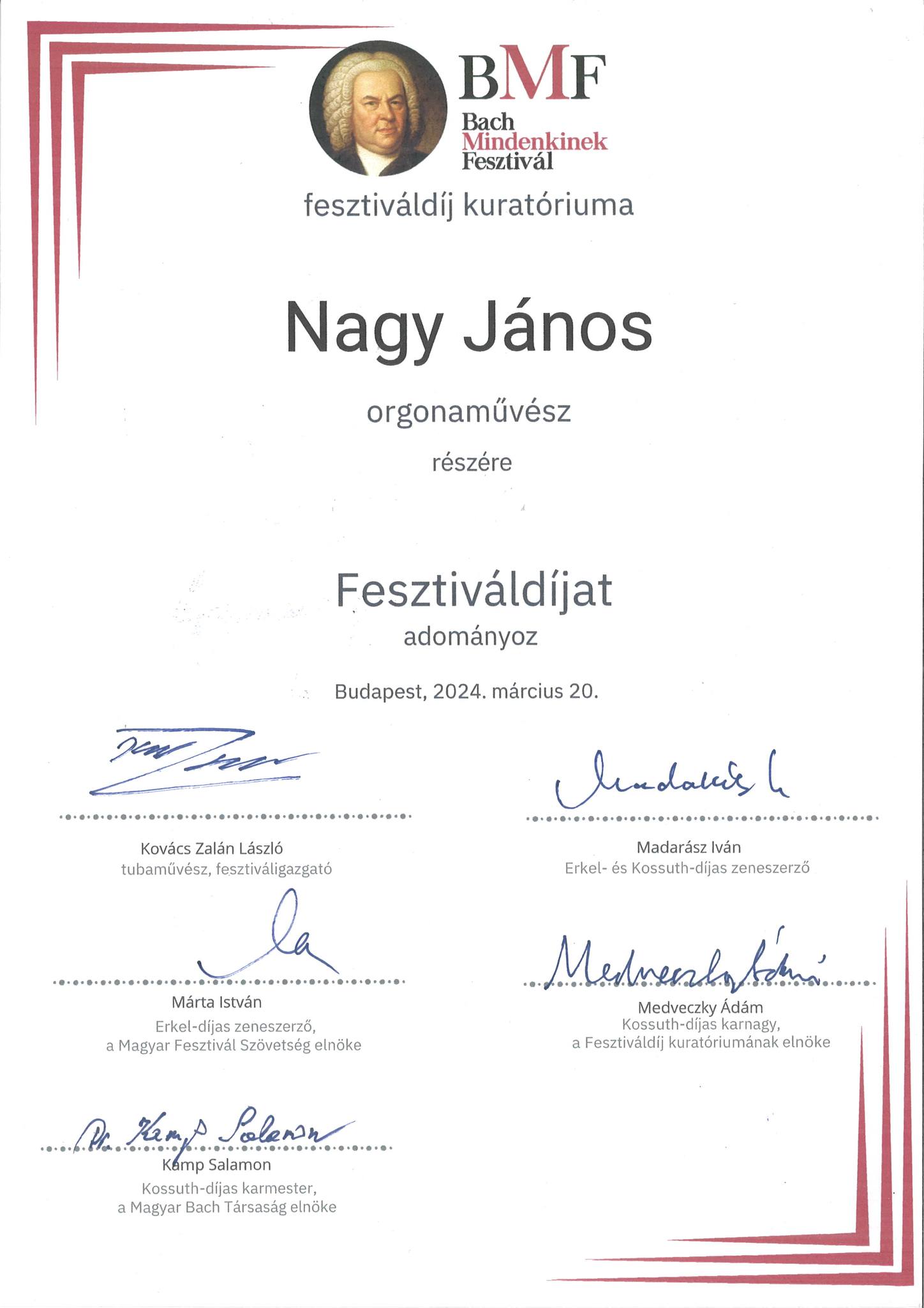 „Talán érdekelheti a kórus tagjait, tulajdonképpen 2024-ben kaptam a Fesztiváldíjat, de betegségeink miatt nem tudtam átvenni a budapesti központi ünnepségen. Néhány hete kaptam meg a fiam közreműködésével. Hatan kaptuk ’24-ben, úgy látom két évente adják. Rangos zsűri, ahogy az aláírókból látható. Örülök neki.” – fogalmazott Nagy János.