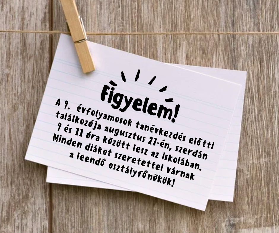 Kedves leendő 9. évfolyamosaink! A beiratkozáskor megbeszélteknek megfelelően augusztus 27-én, szerdán 9 órakor találkozhattok osztályfőnökeitekkel és osztálytársaitokkal, hogy az első tanítási napon már ismerősökként léphessetek be az iskolába. Várunk benneteket! ❤️