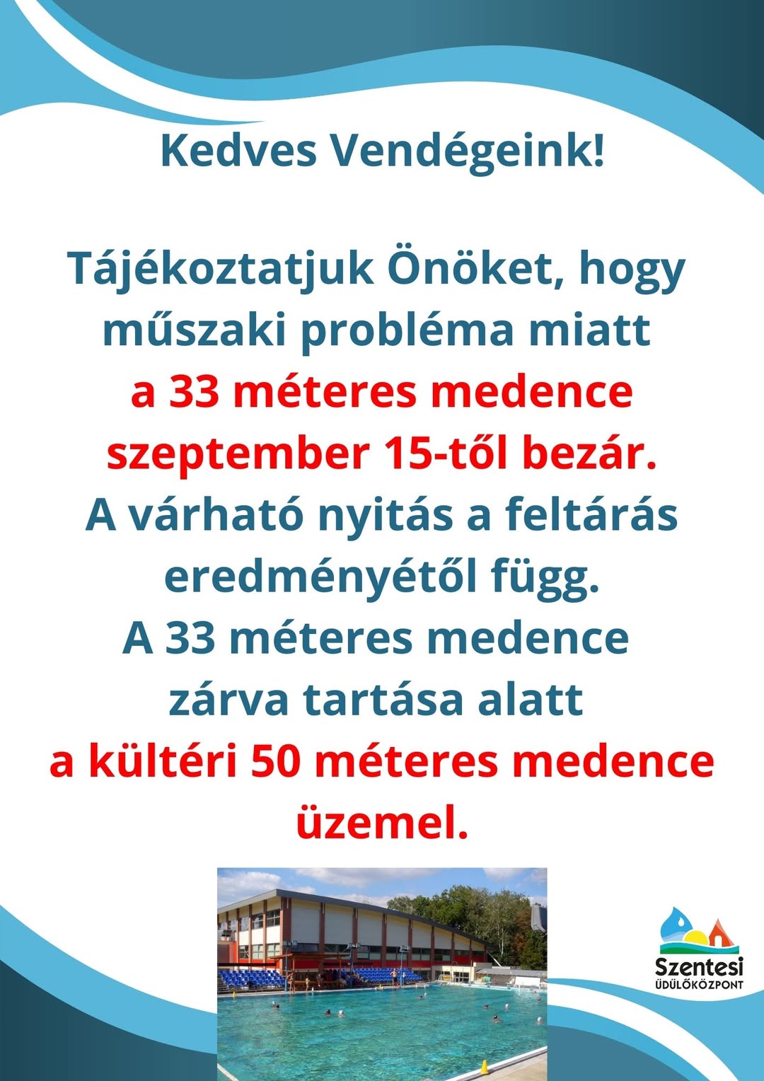 ❗️A Szentesi Sport és Üdülőközpont tájékoztatja vendégeit, hogy a 33 méteres medence műszaki okok miatt szeptember 15-től leáll.