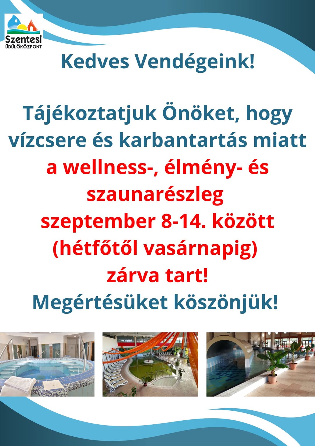 A Szentesi Sport és Üdülőközpont értesíti vendégeit, hogy szeptember második hetében az élmény-, wellness- és szaunarészleg vízcseréjét és karbantartását végzik.🛠️